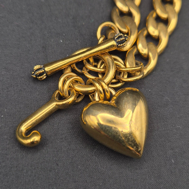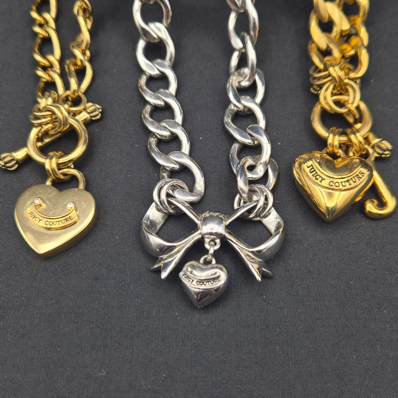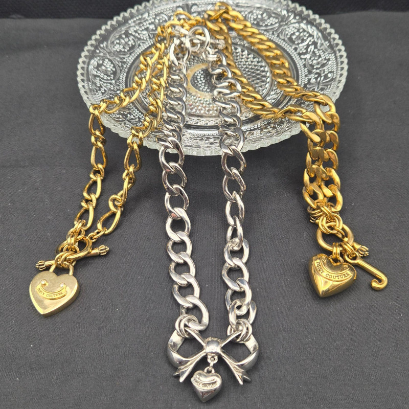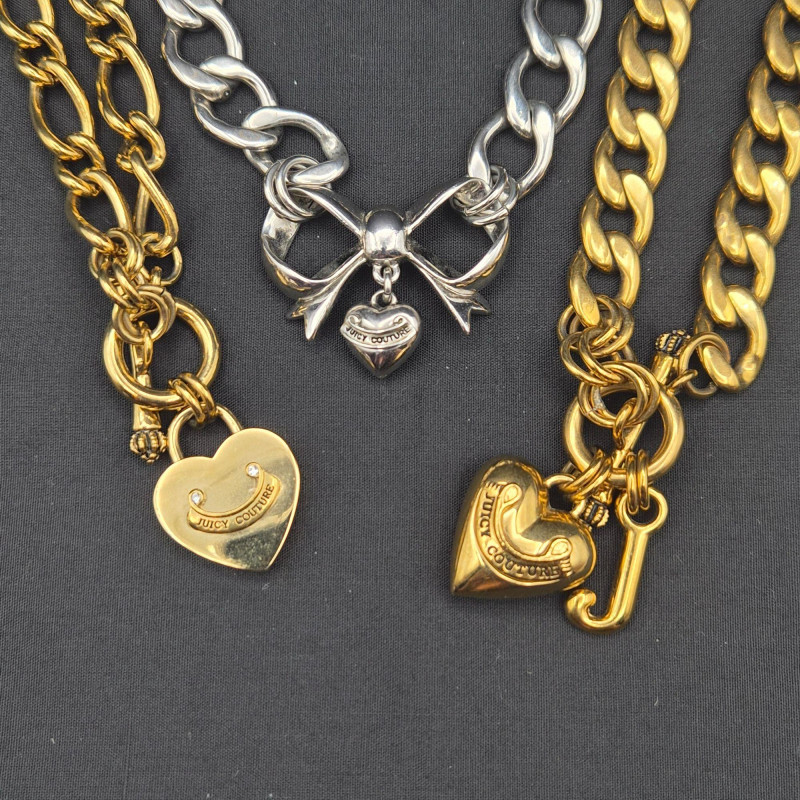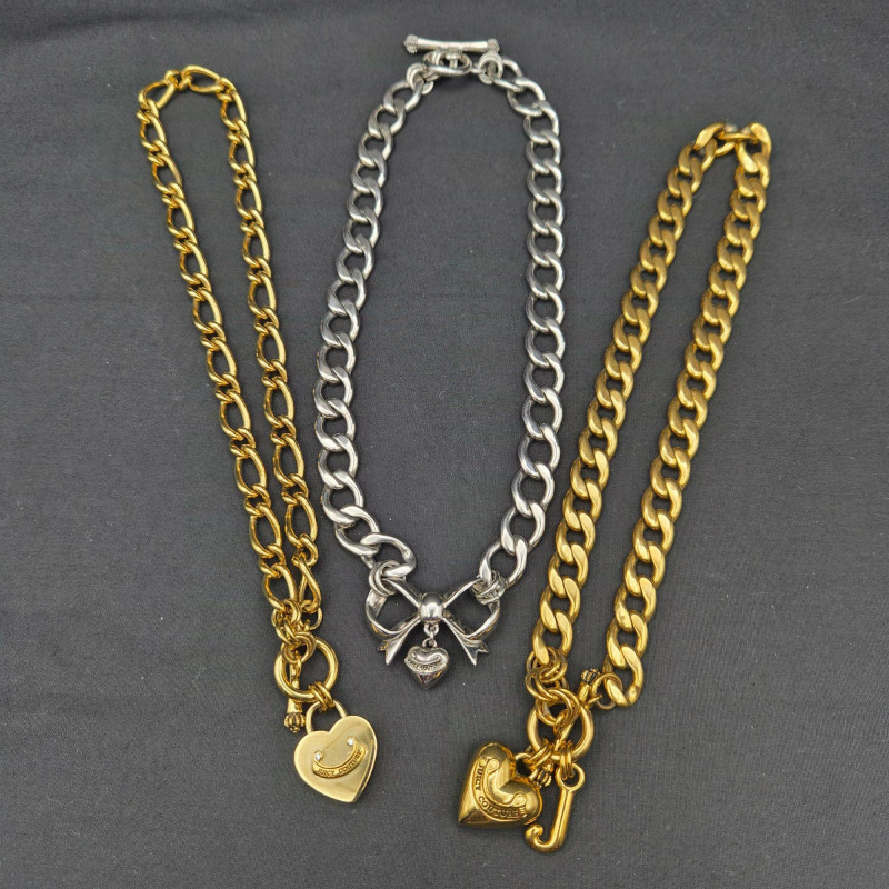 A trio of heavy chain link choker necklaces by Juicy Couture, each measuring 14"–15" in length. Designed in both gold and silver tones, these necklaces embody Juicy’s iconic mix of luxury and street-style edge. This set delivers three ways to shine, ideal for collectors of designer costume jewelry or anyone looking to add a touch of Y2K-inspired glam to their wardrobe.