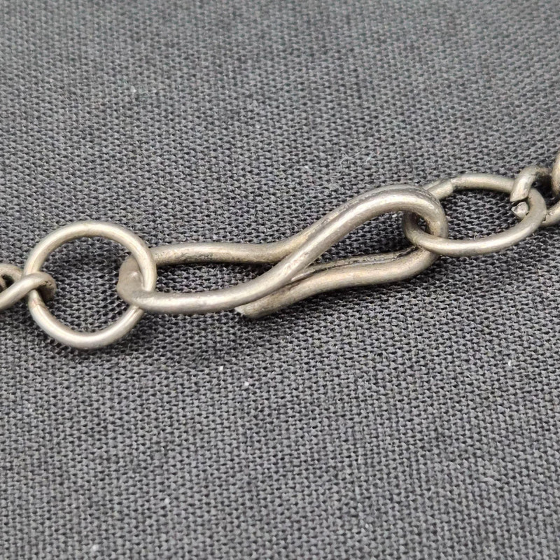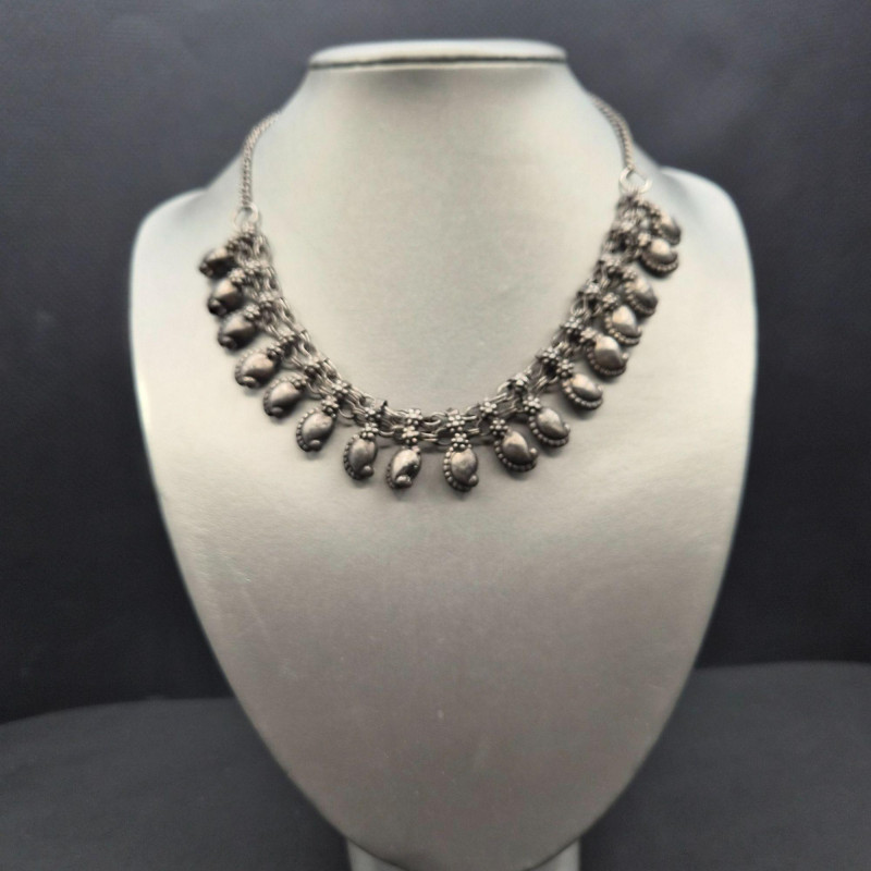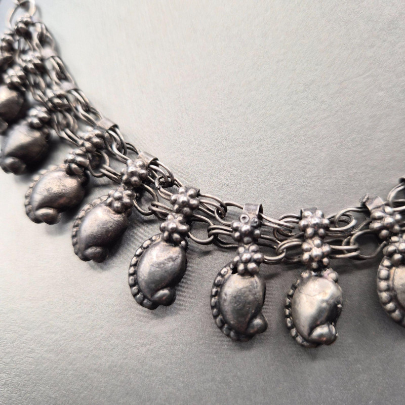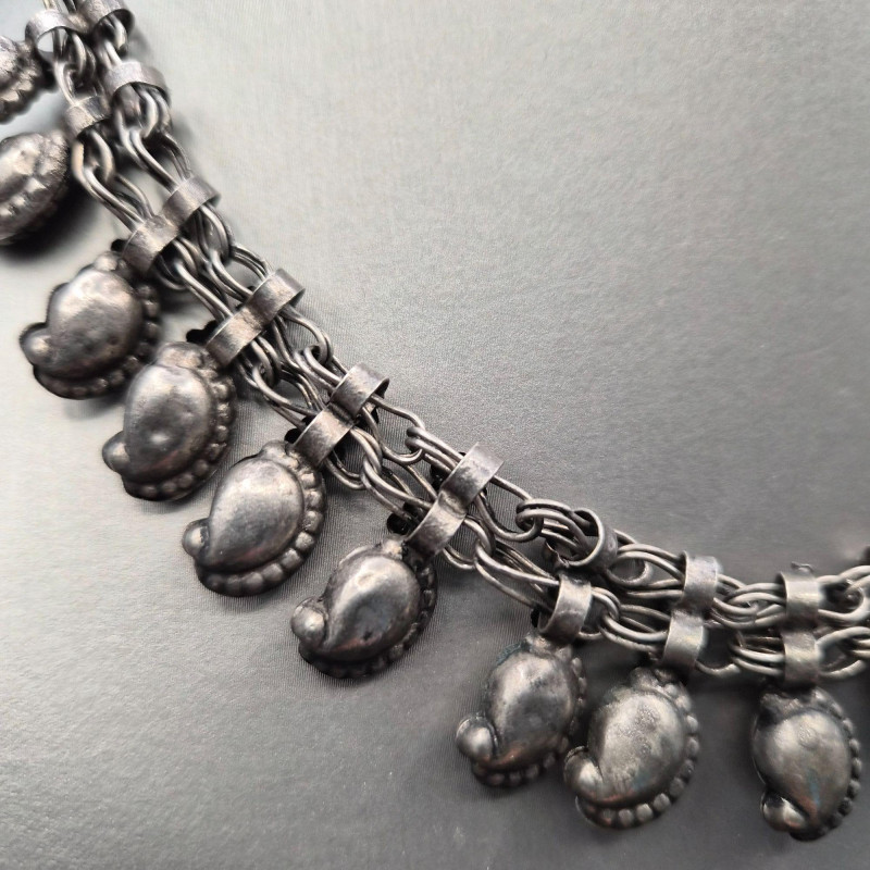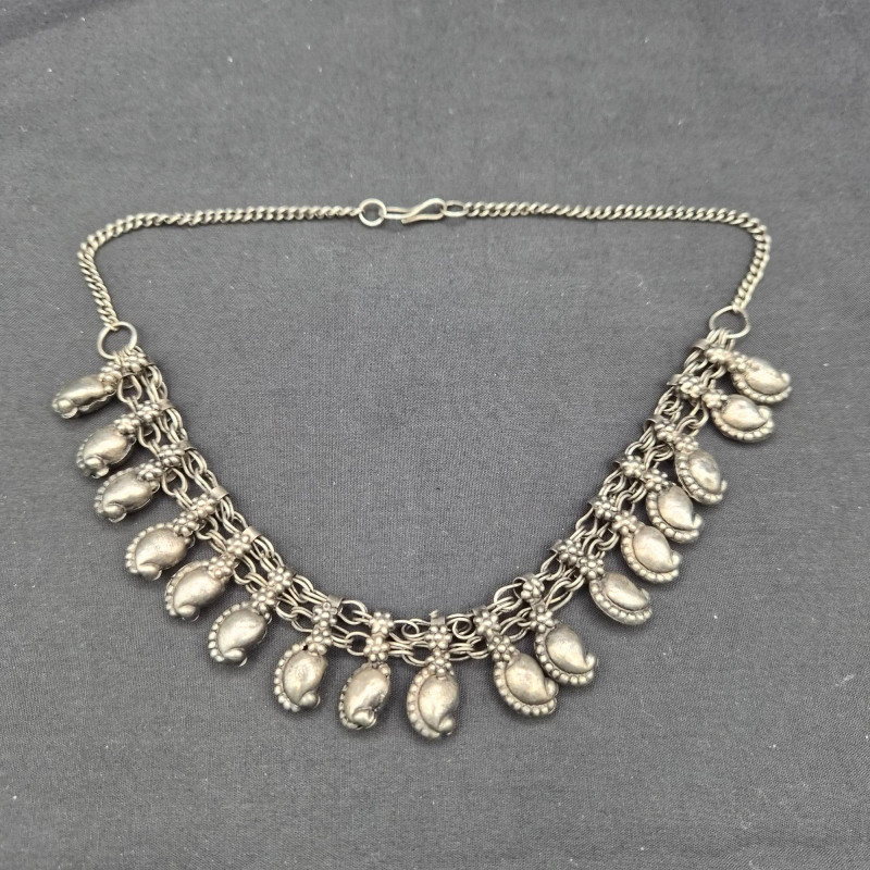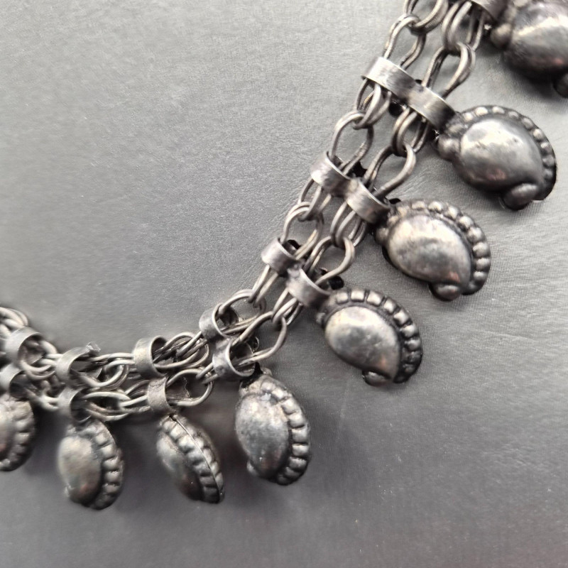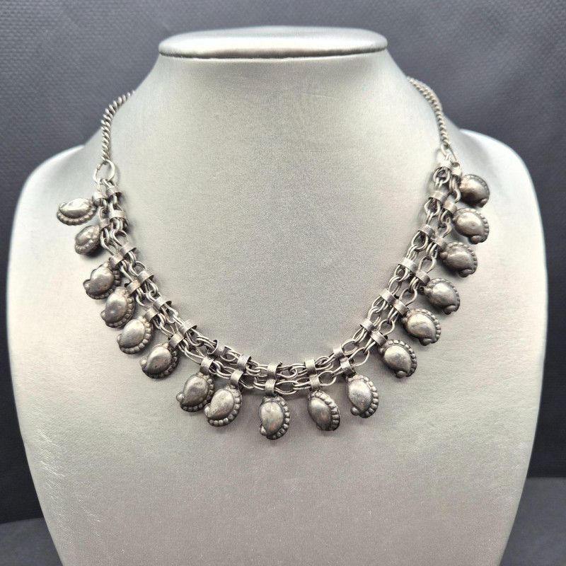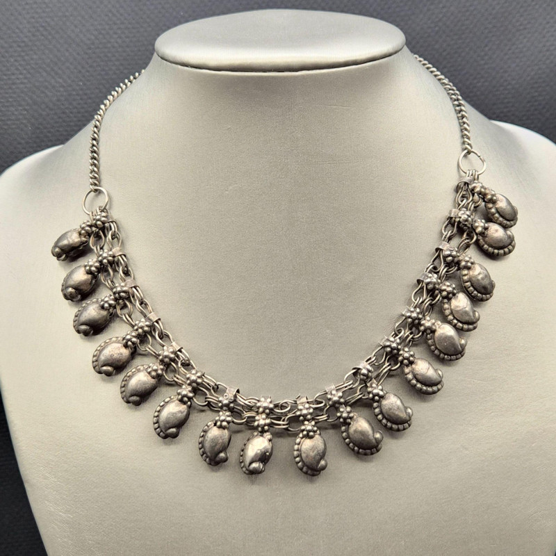 Handmade tribal/ceremonial necklace crafted in silver-toned metal, adorned with decorative hollow paisley-shaped jingle dangles that create gentle movement and sound. Measuring 15.5" in length, this unsigned piece carries an air of authentic craftsmanship and cultural resonance. Perfect for collectors of tribal jewelry, statement pieces, or ethnographic adornments, this necklace embodies both ornament and ritual spirit.