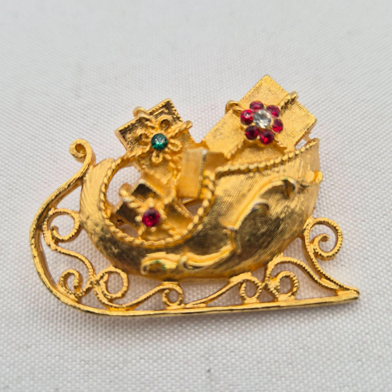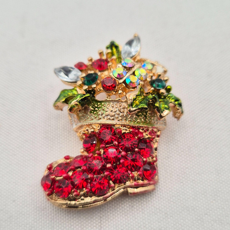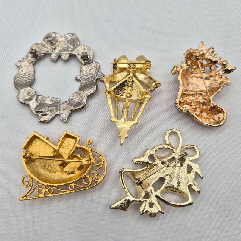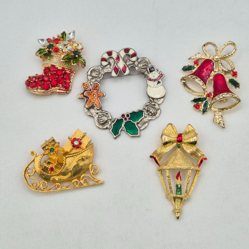 A cheerful collection of vintage holiday brooches, perfect for accessorizing or gifting during the season: This lot offers a nostalgic mix of holiday jewelry, ideal for collectors, crafters, or anyone curating a seasonal look filled with joy and shimmer.