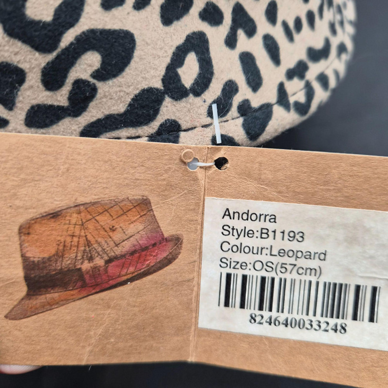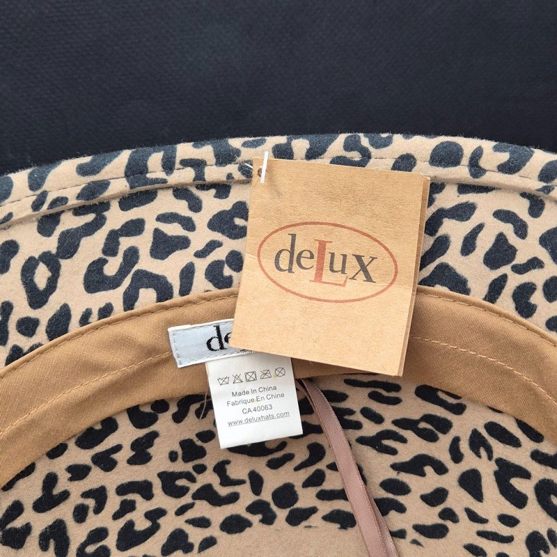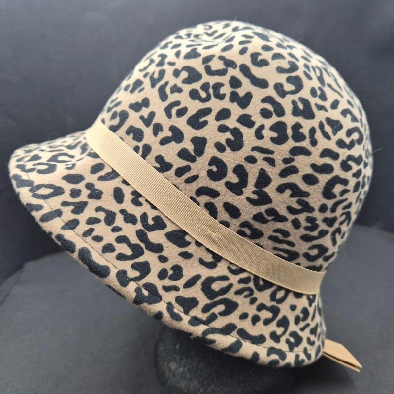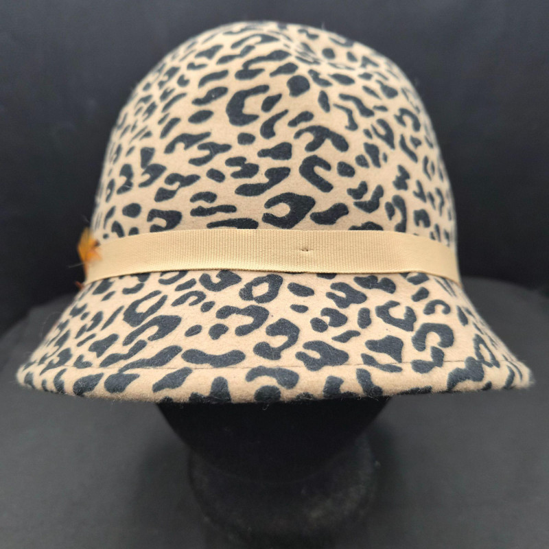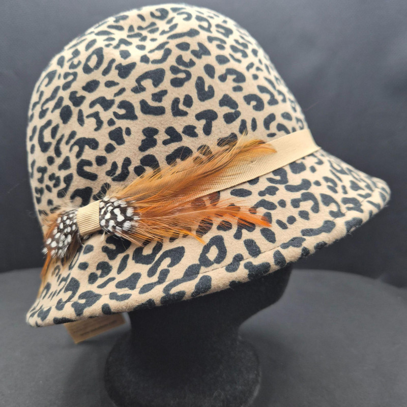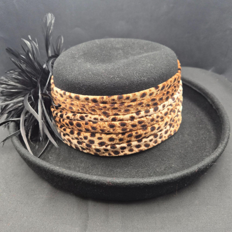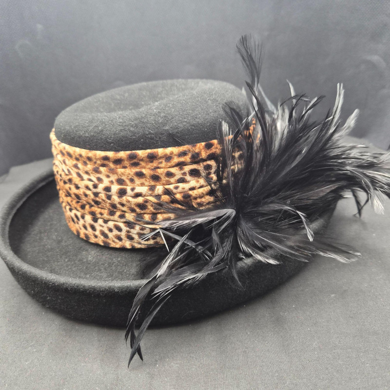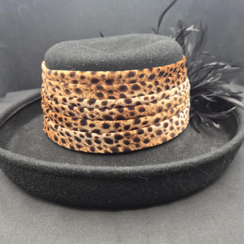 A stylish duo of women’s fashion hats, blending bold animal prints with fine millinery details: