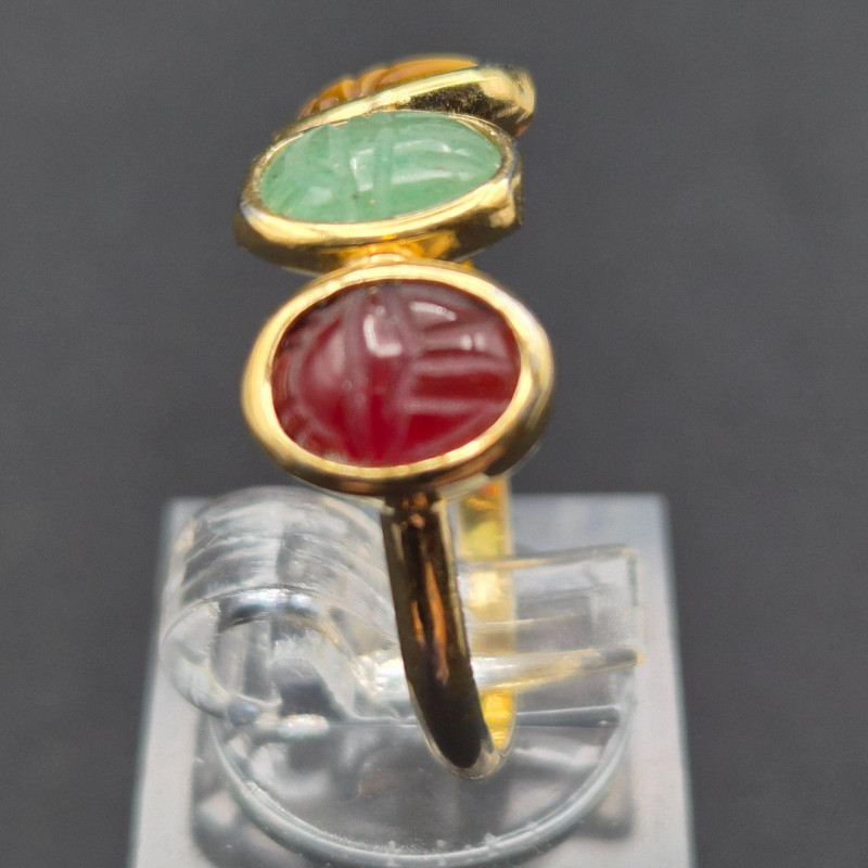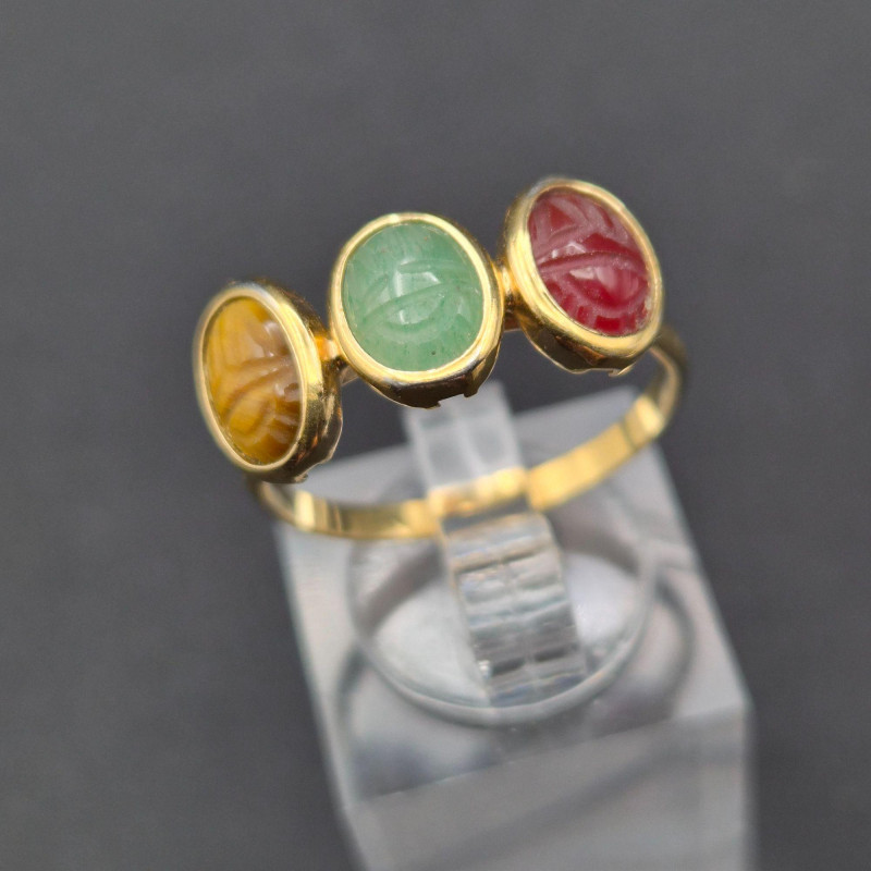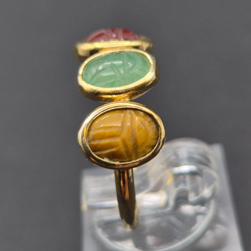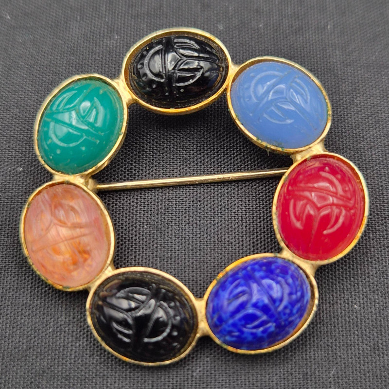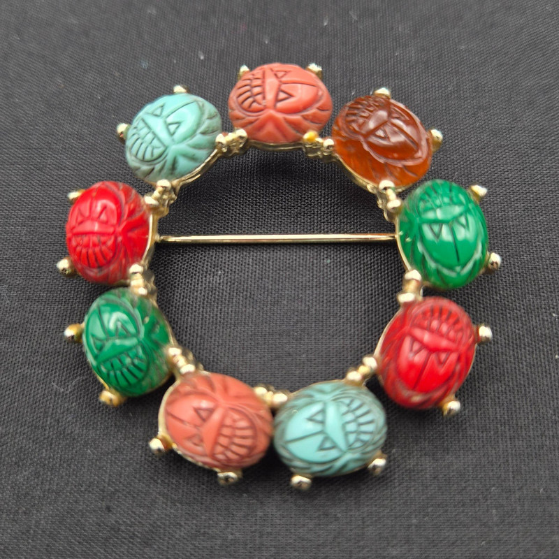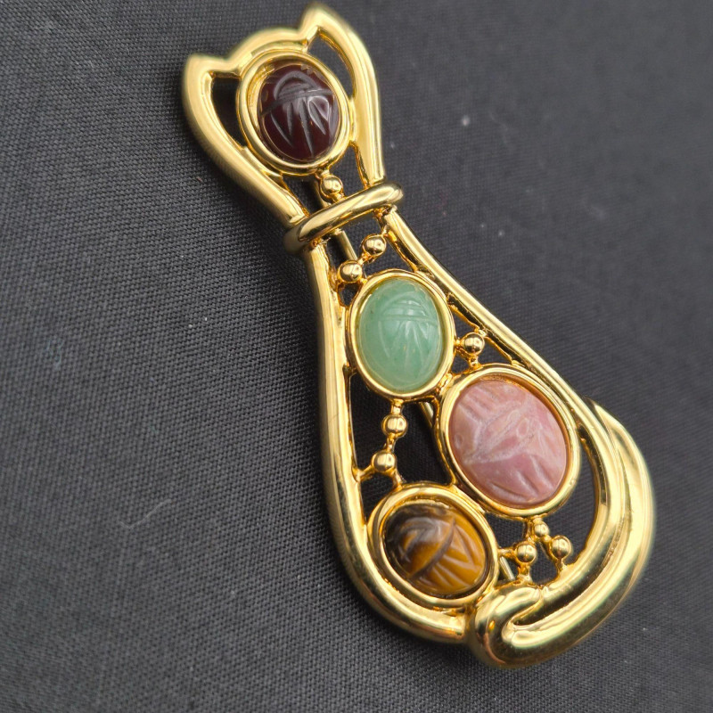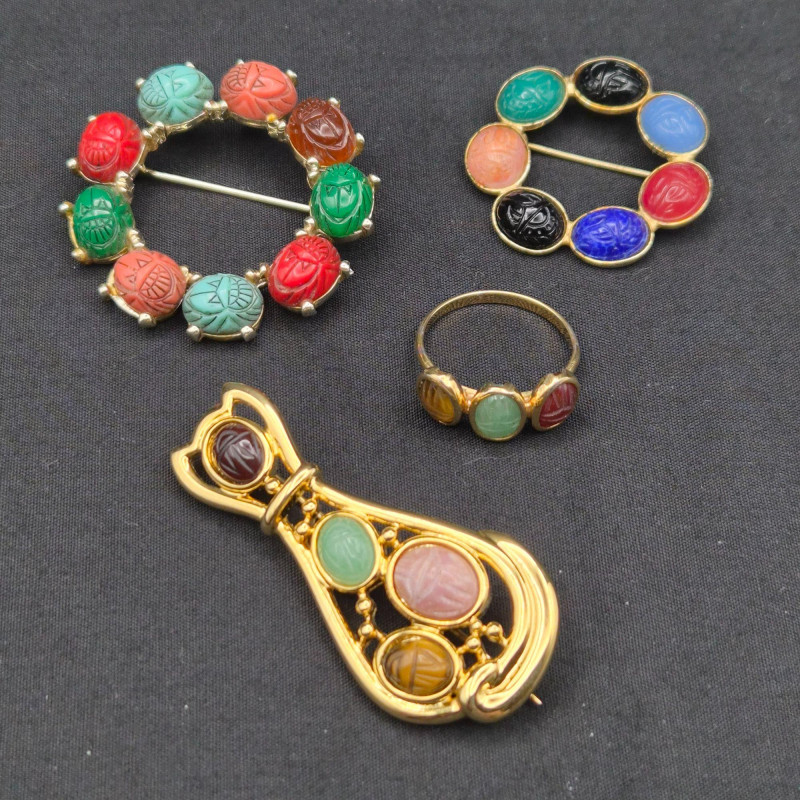 A distinctive scarab-themed jewelry assortment in the style of Burt Castell, blending carved stones with vintage gold-tone settings: This lot captures the symbolic appeal of scarabs, long associated with protection and renewal