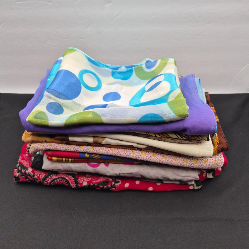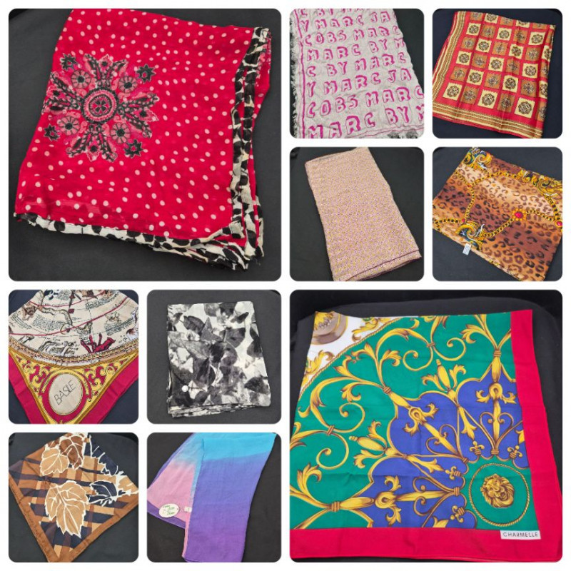 A fashionable assortment of designer and vintage scarves, blending fine silk with sheer fabrics: This lot offers designer names, French silk craftsmanship, and versatile styling options.