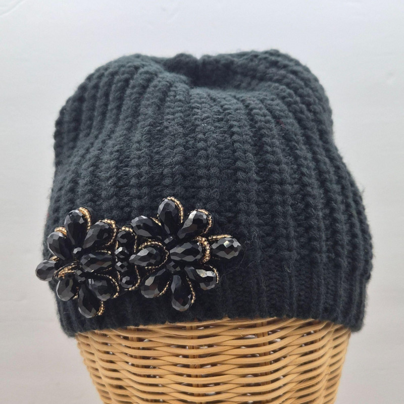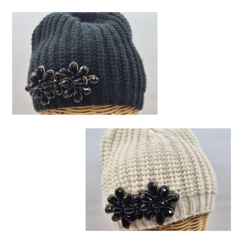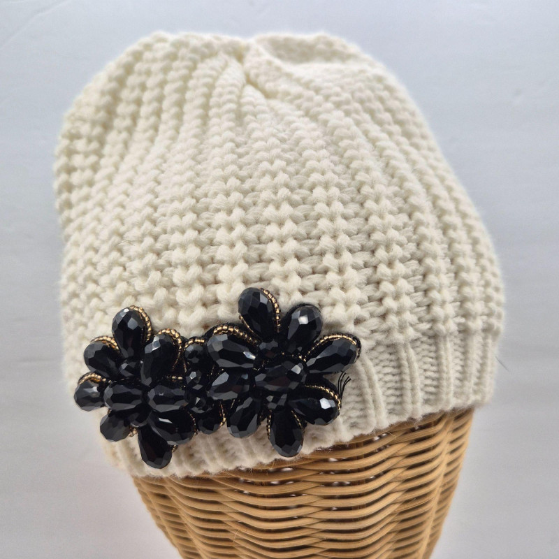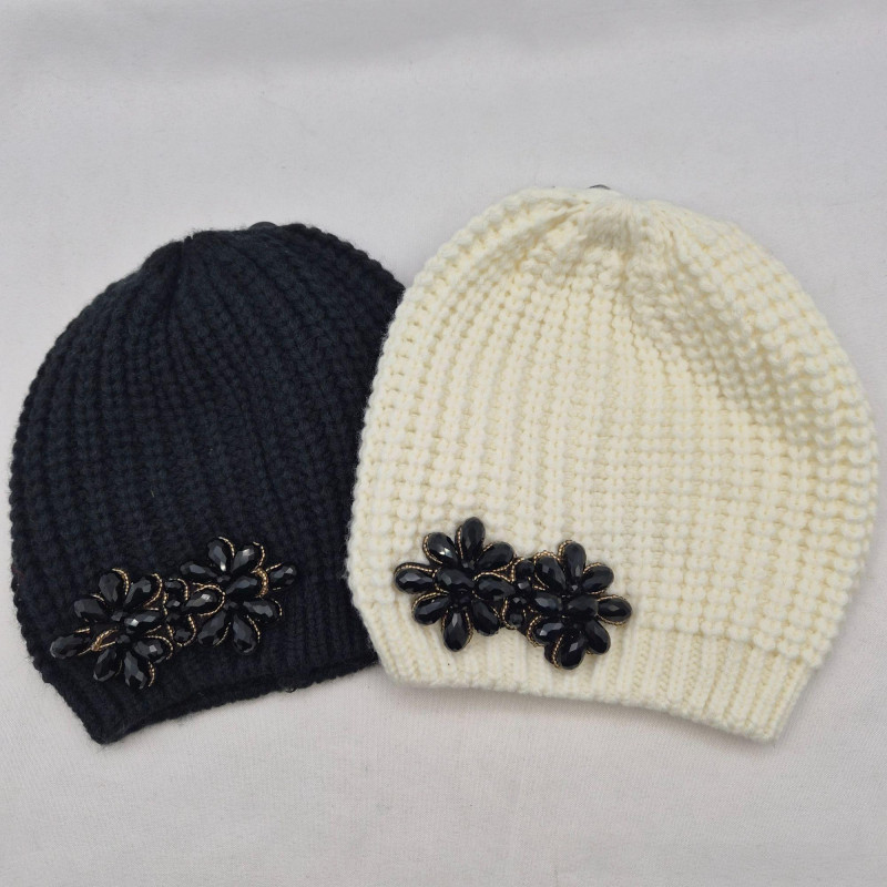 Lot # 89 - Two New Knit Hats - Black, Ivory Colored, Faceted Crystal Accents
