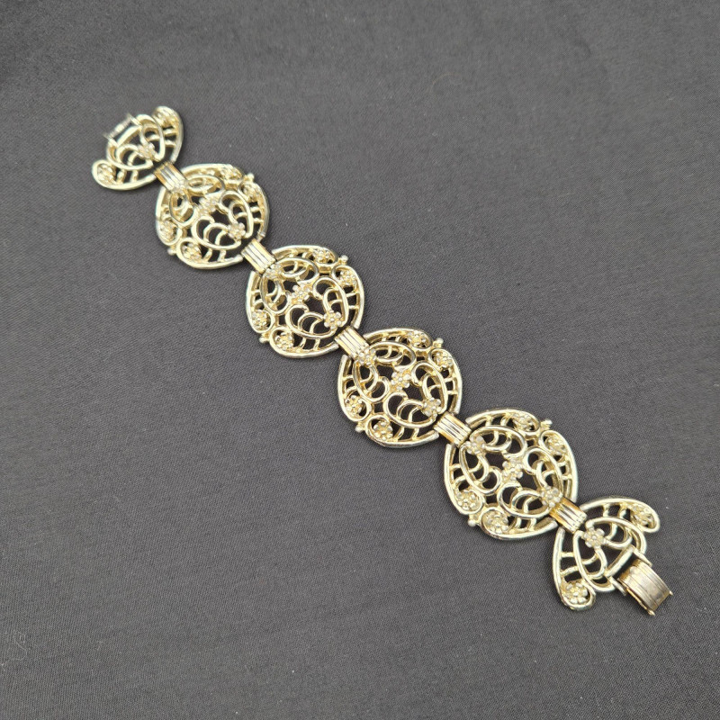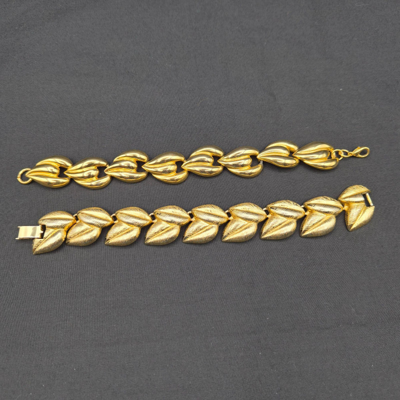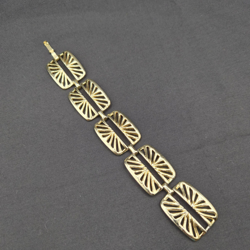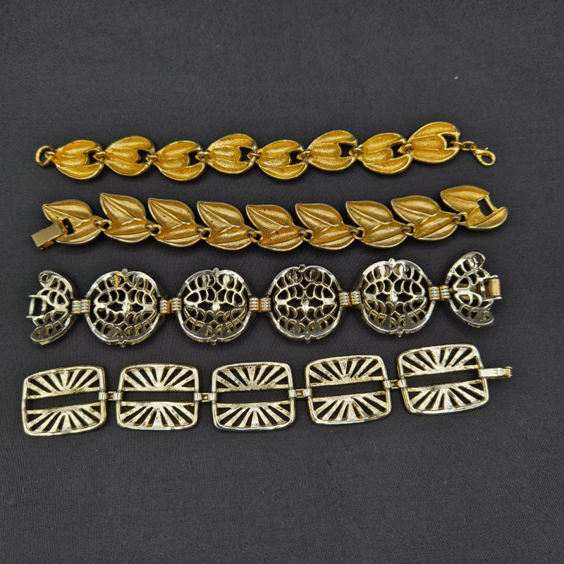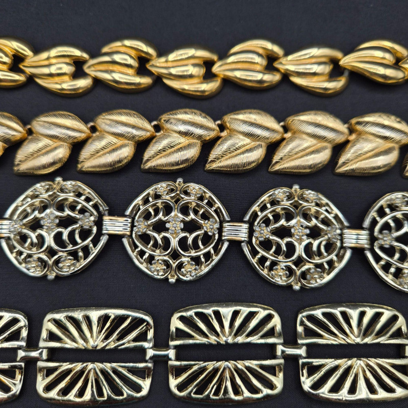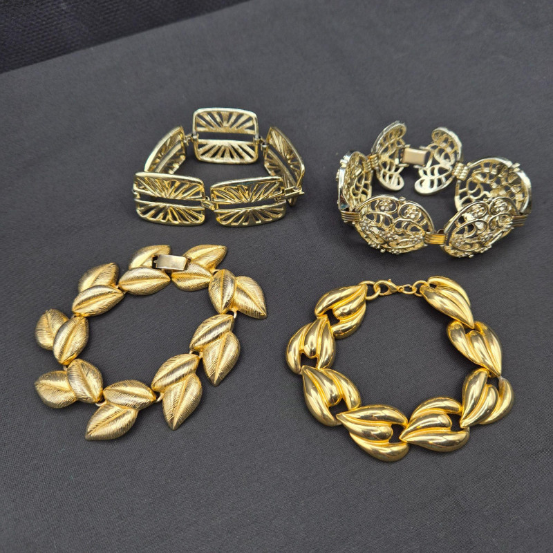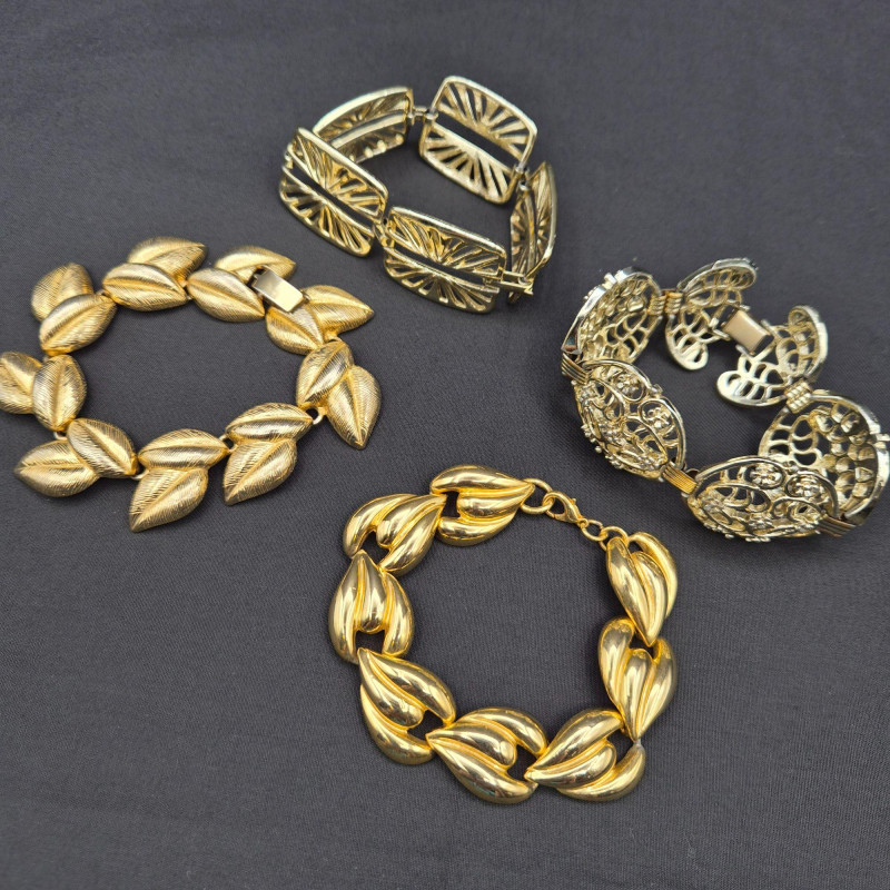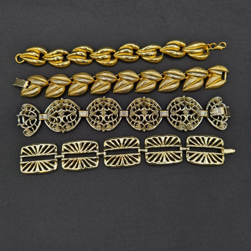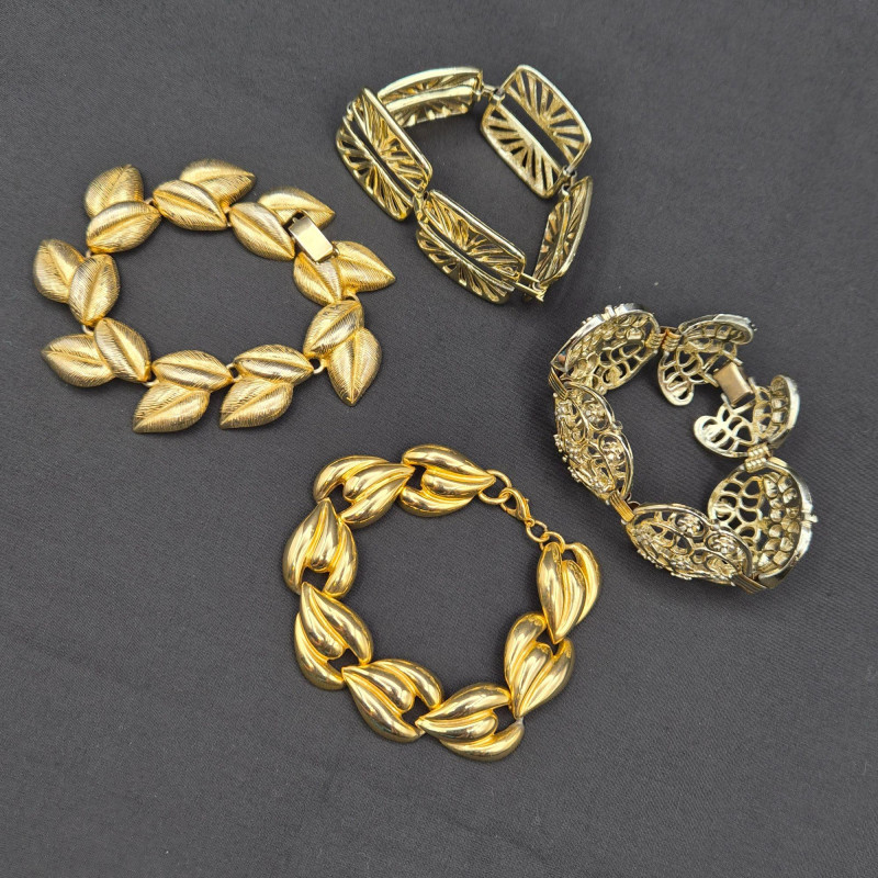 Four vintage gold tone panel link bracelets, each crafted in warm gold tone metal: These bracelets offer timeless fashion versatility, whether worn individually or layered for a bold statement.