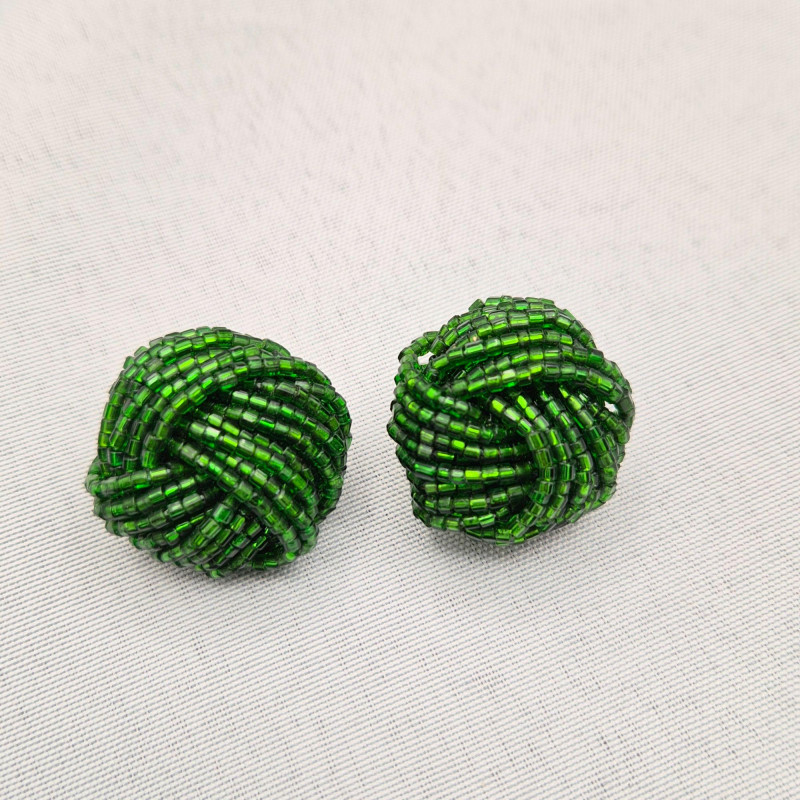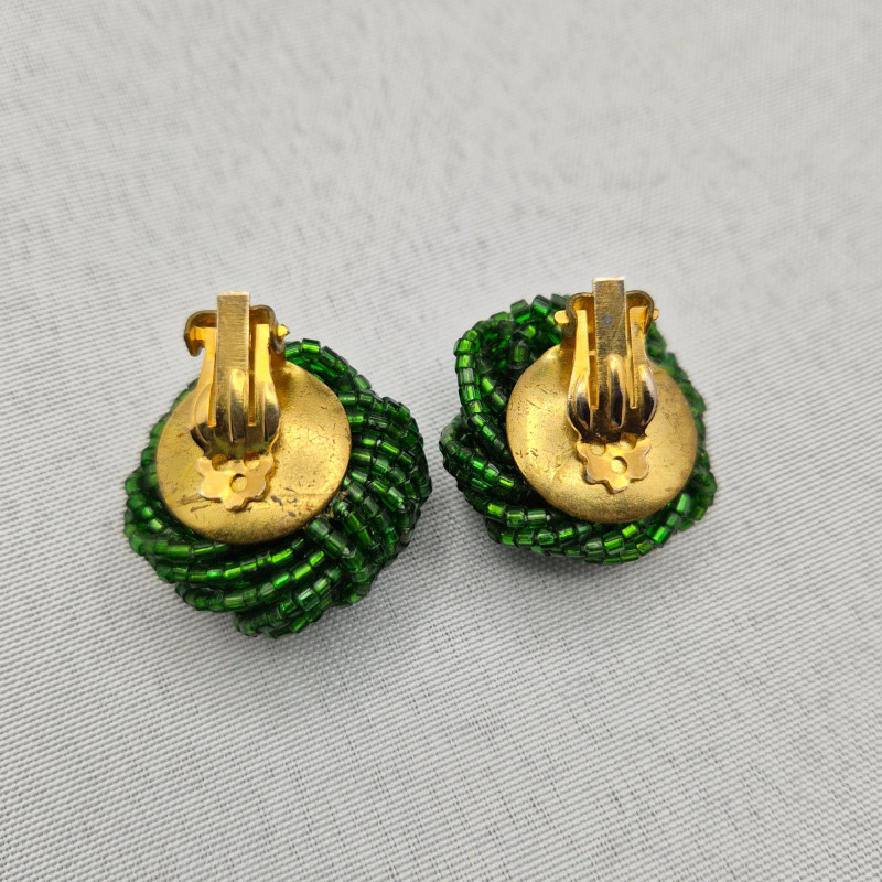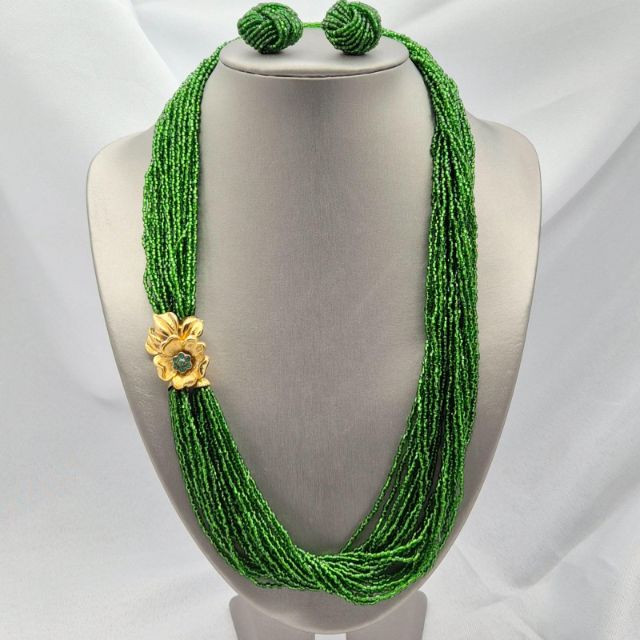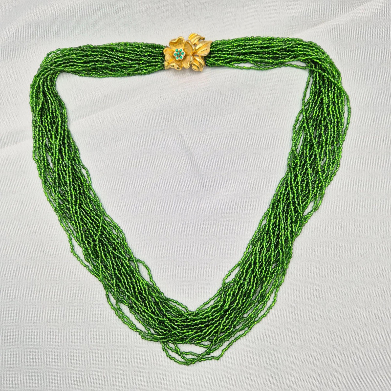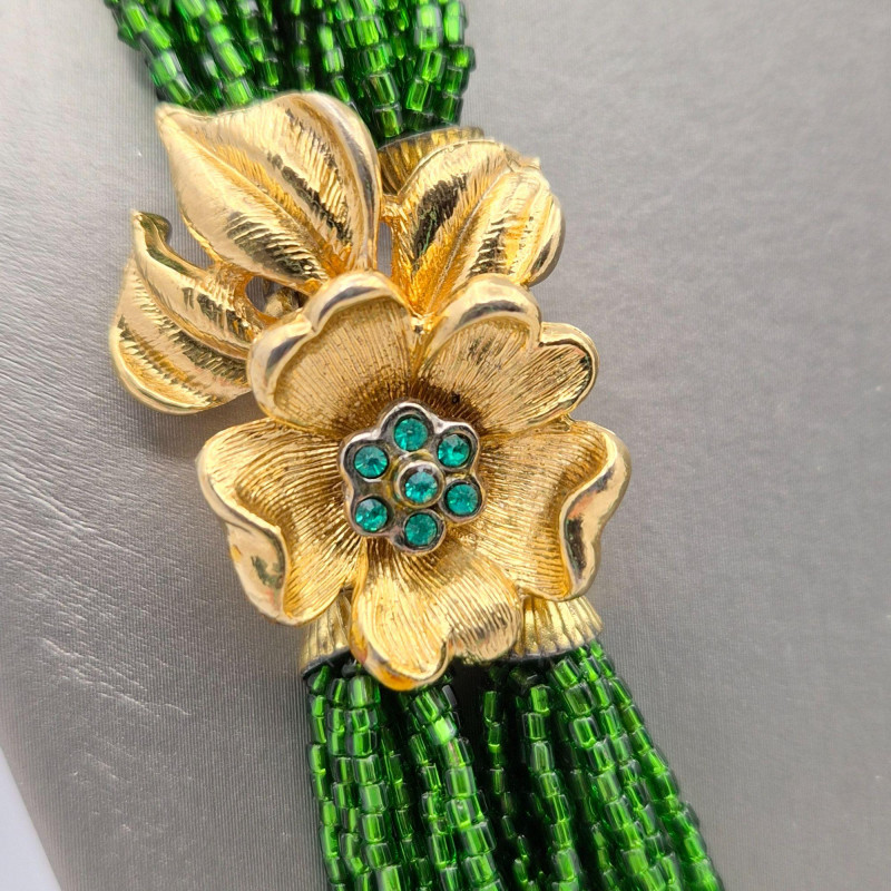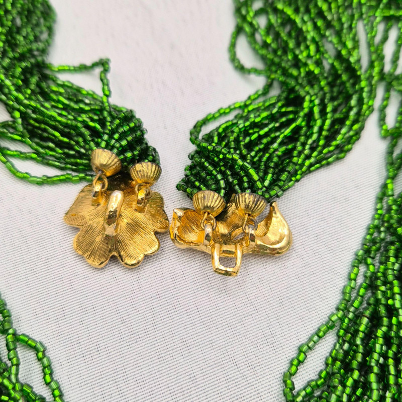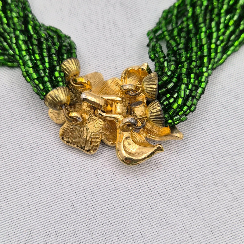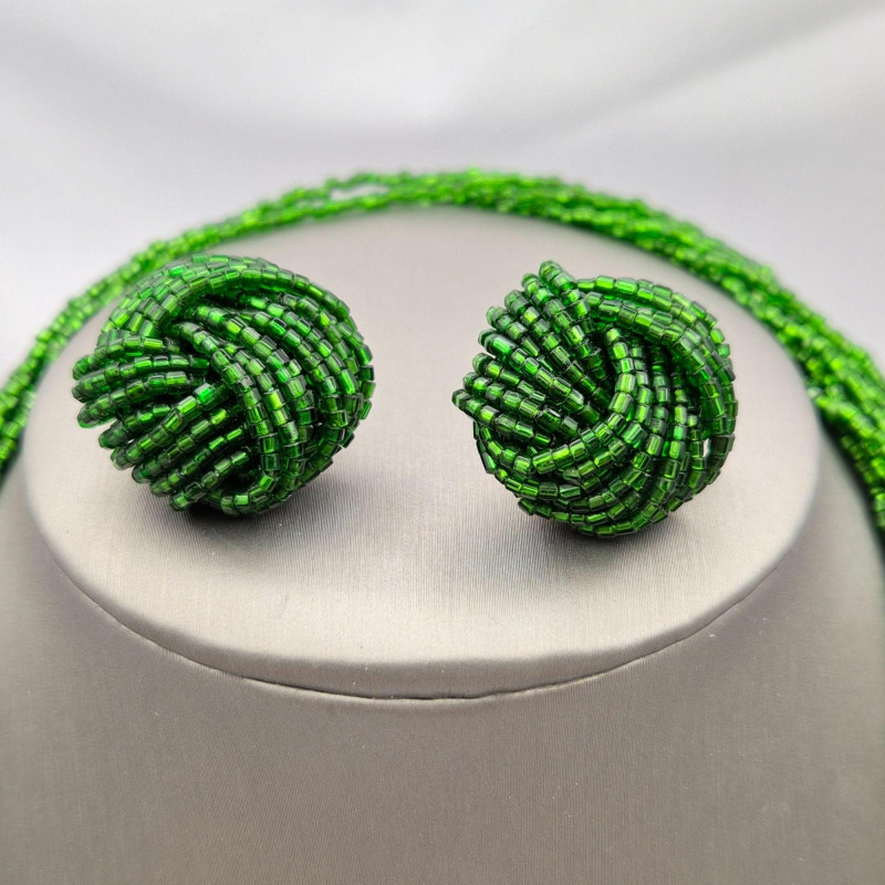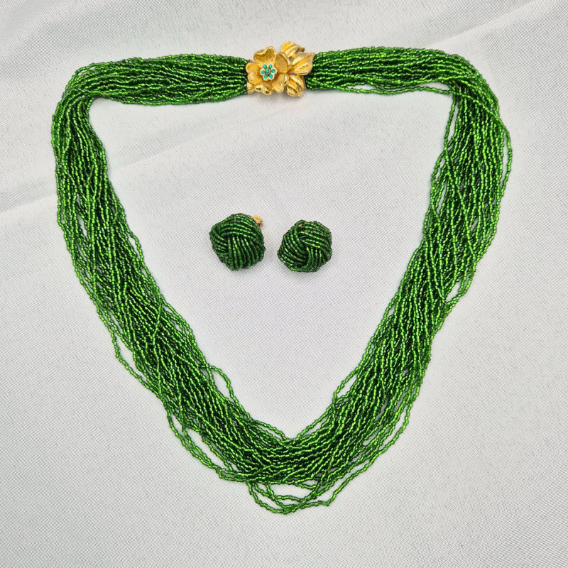 A dazzling mid‑century style green seed bead ensemble, brimming with texture and light: This set embodies glamorous retro elegance, perfect for collectors of vintage costume jewelry or anyone seeking a vibrant statement piece. The layered strands and rhinestone clasp make the necklace a centerpiece, while the earrings add balance and charm.