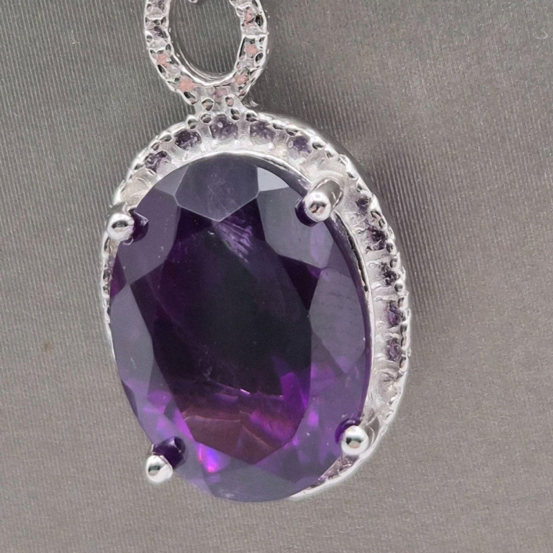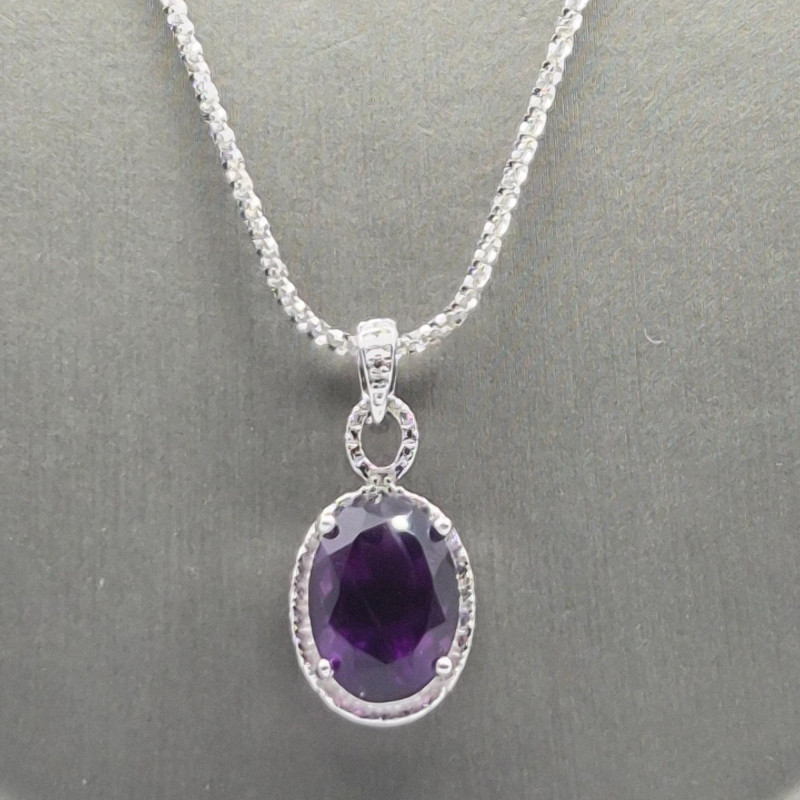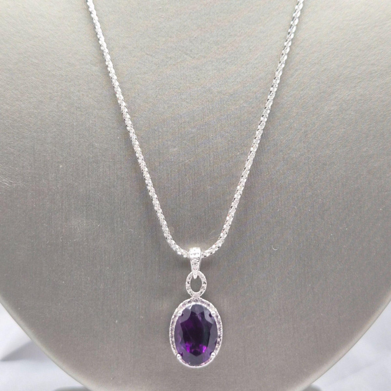 A timeless and radiant piece of sterling silver jewelry featuring a classic amethyst solitaire pendant: