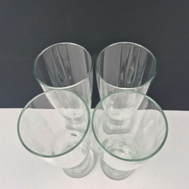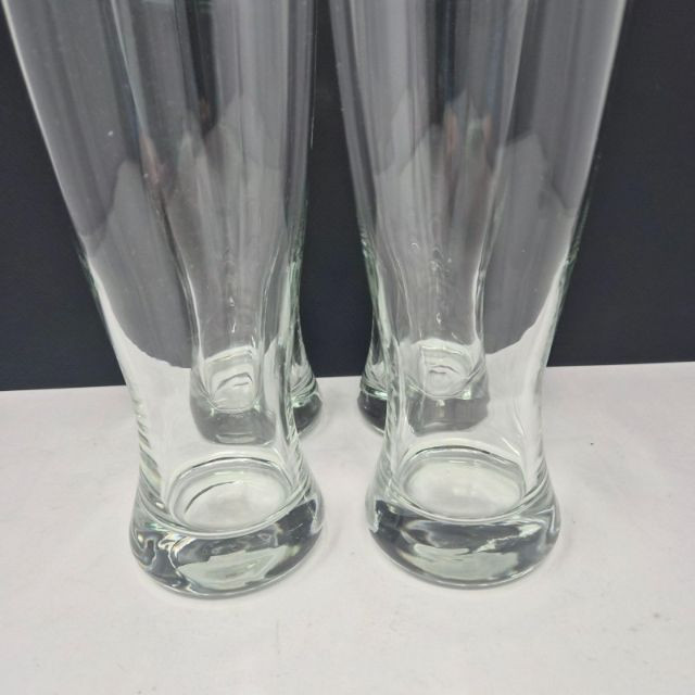 Classic set of four tall beer barware glasses, each standing 9" high with a thick, weighted base for stability. These stein‑style glasses hold approximately 24 ounces, making them perfect for craft beer, iced beverages, or casual entertaining.