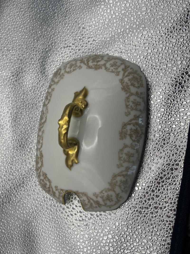A distinguished grouping of Limoges D&C France serving pieces made for Higgins & Seiter, featuring an ornate gold gilt damask‑style pattern. This coordinated set brings classic French porcelain elegance to the table. Includes: Condition: Some expected gold paint wear from age. Gravy boat has a minor corner chip. Includes a lid (does not appear in main picture). A beautiful antique set for collectors of Limoges, formal serving ware, or turn‑of‑the‑century porcelain.