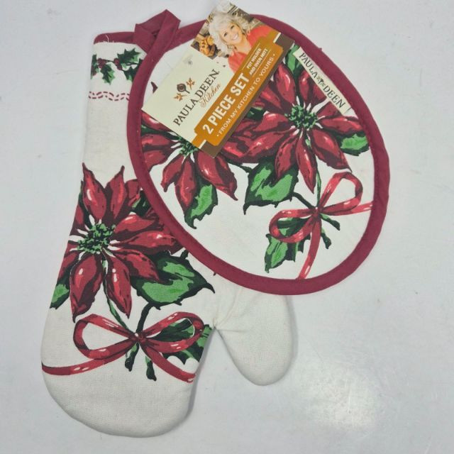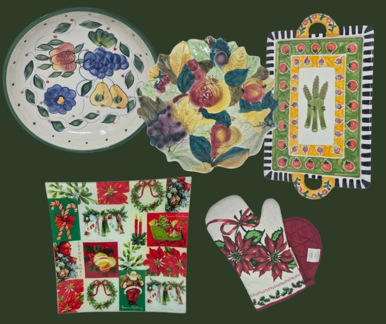 A cheerful set of decorative hand‑painted pottery platters and square glass holiday plate with new Paula Deen pot holders. Perfect for entertaining, display, or adding a splash of color to the kitchen.