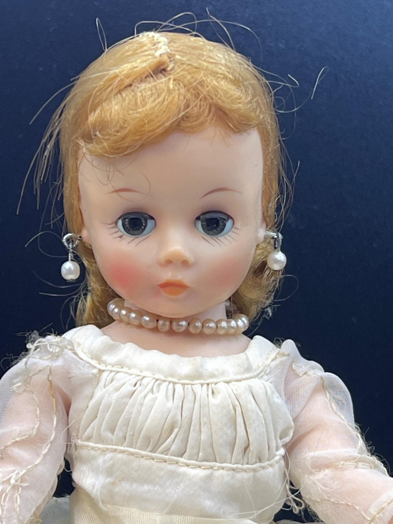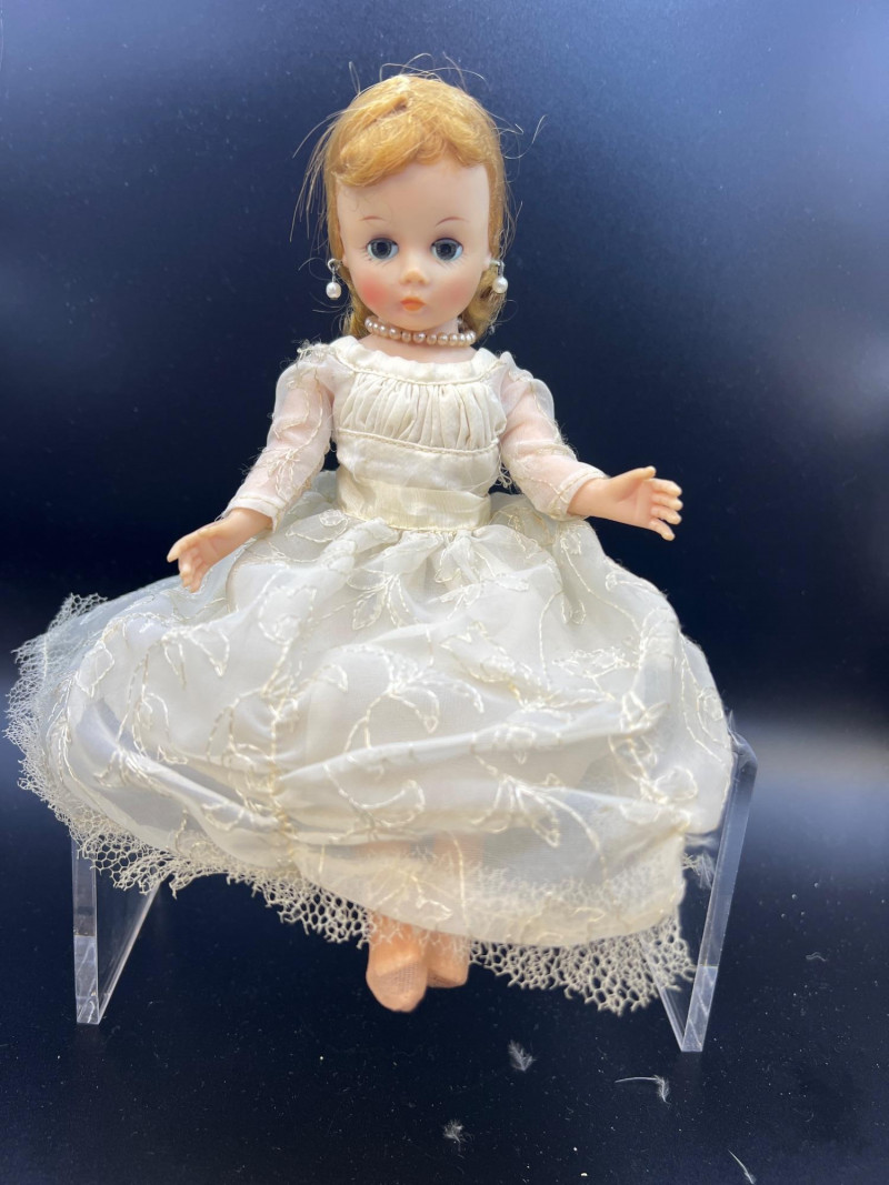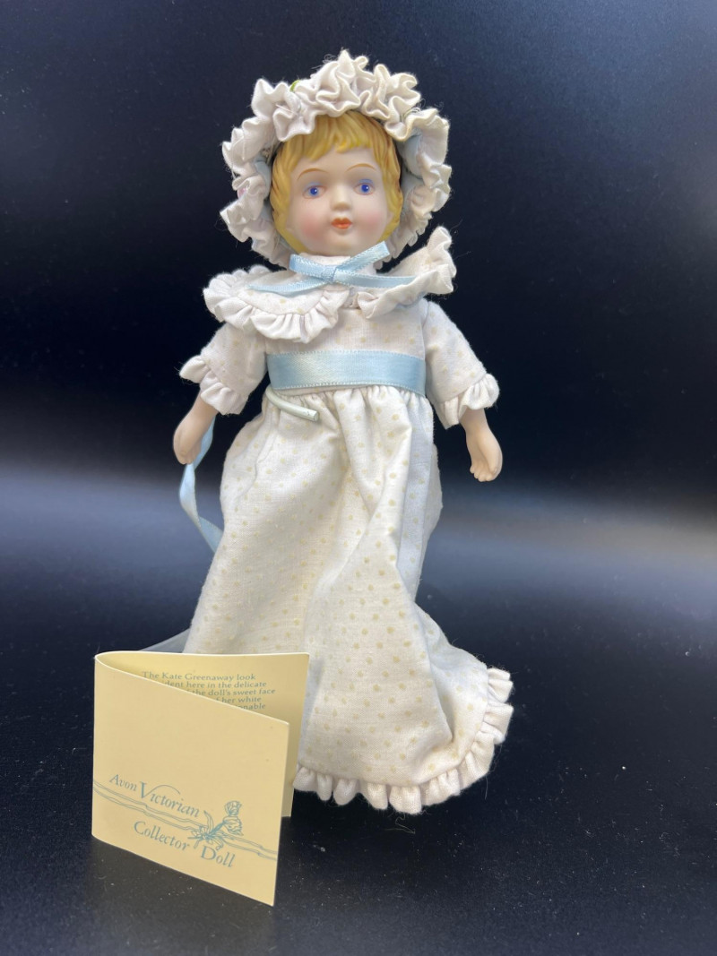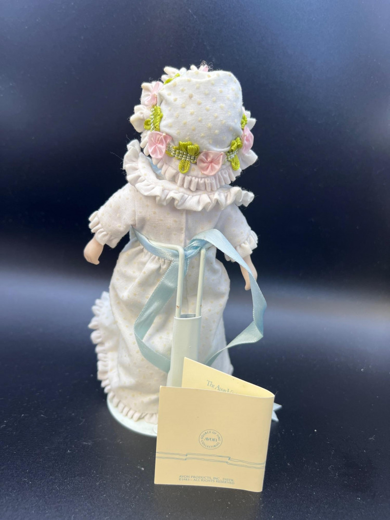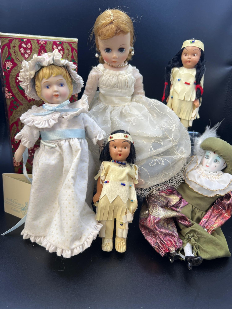 Charming mixed doll collection featuring four distinct styles and eras: Avon Victorian Doll 6" tall with stand – A classic Avon collectible dressed in period‑inspired attire with bonnet and ribbon detailing. Madame Alexander Jointed Cissette Wedding Doll - 6" tall – Beautifully costumed in a lace wedding gown with pearl accents; jointed body typical of the Cissette line, known for its elegance and fine facial painting. Two Composite Indian Dolls (Made in Japan) – Vintage hand‑painted figures in traditional attire with beadwork and fringe. Mid‑century Japanese export pieces with expressive faces and cultural costume detail. Pierrot Doll – A theatrical figure in colorful costume with painted face, capturing the whimsical, melancholy charm of the classic Pierrot character. A delightful, eclectic grouping ideal for collectors of vintage dolls, international figures, and character‑themed display pieces.