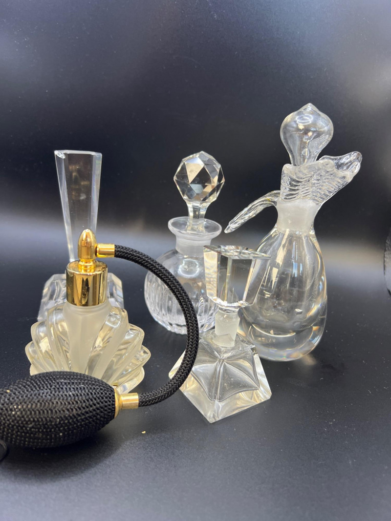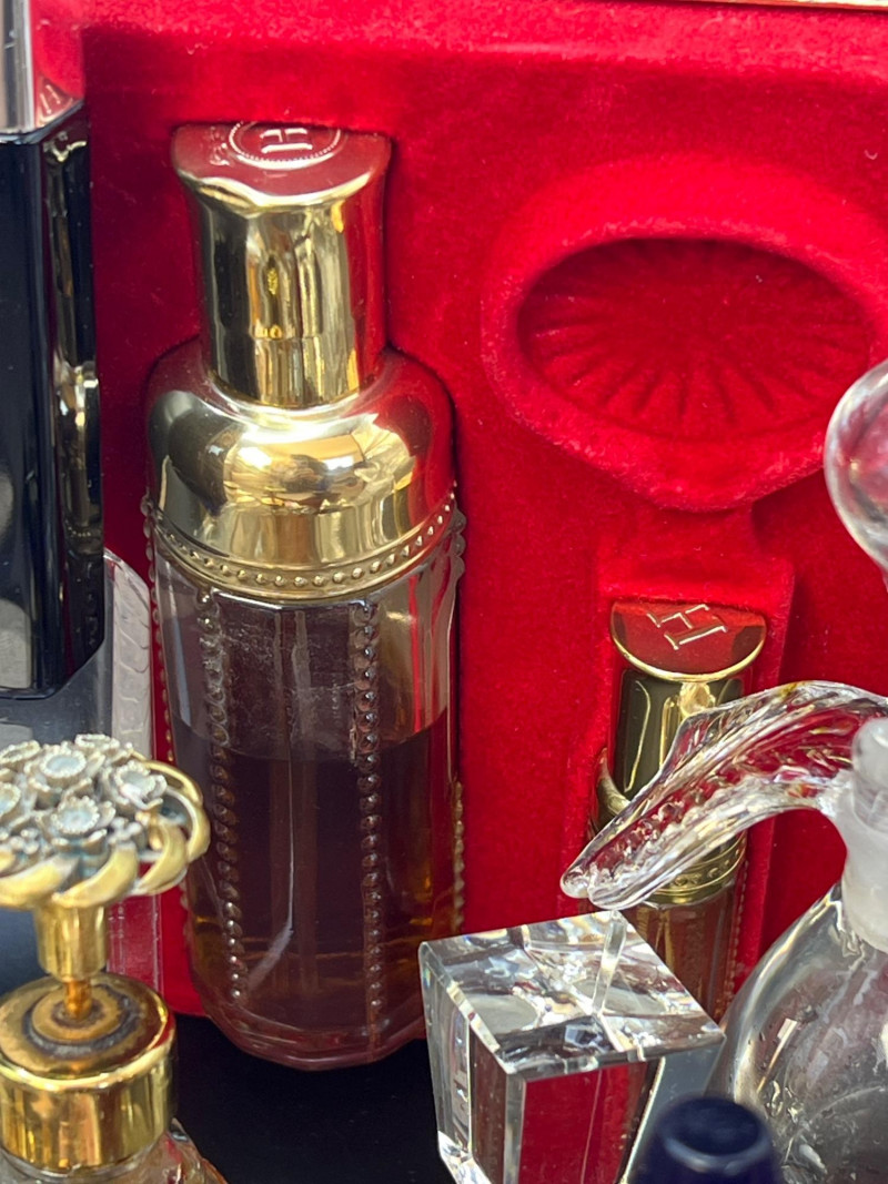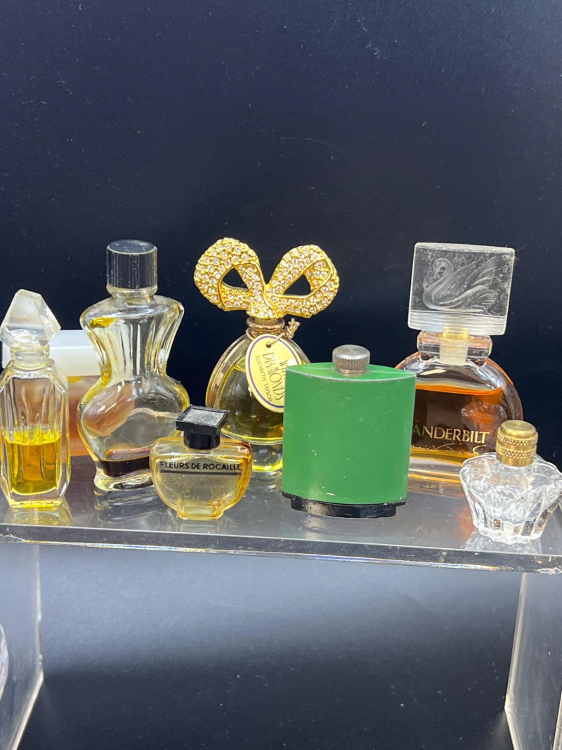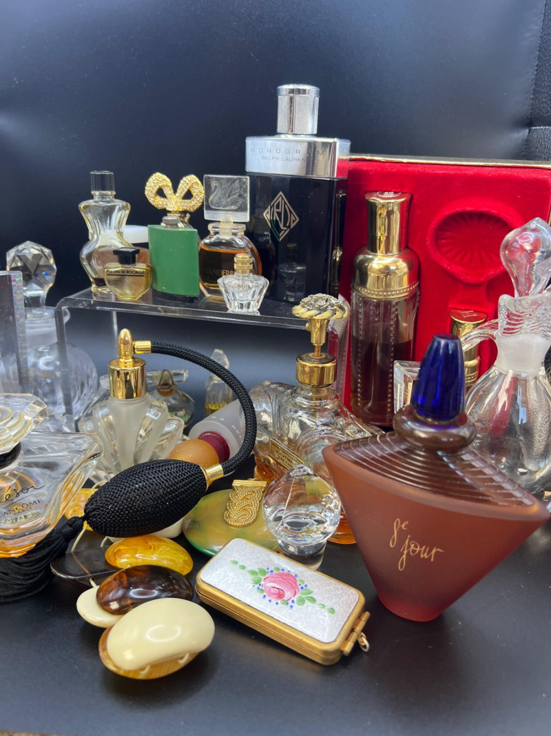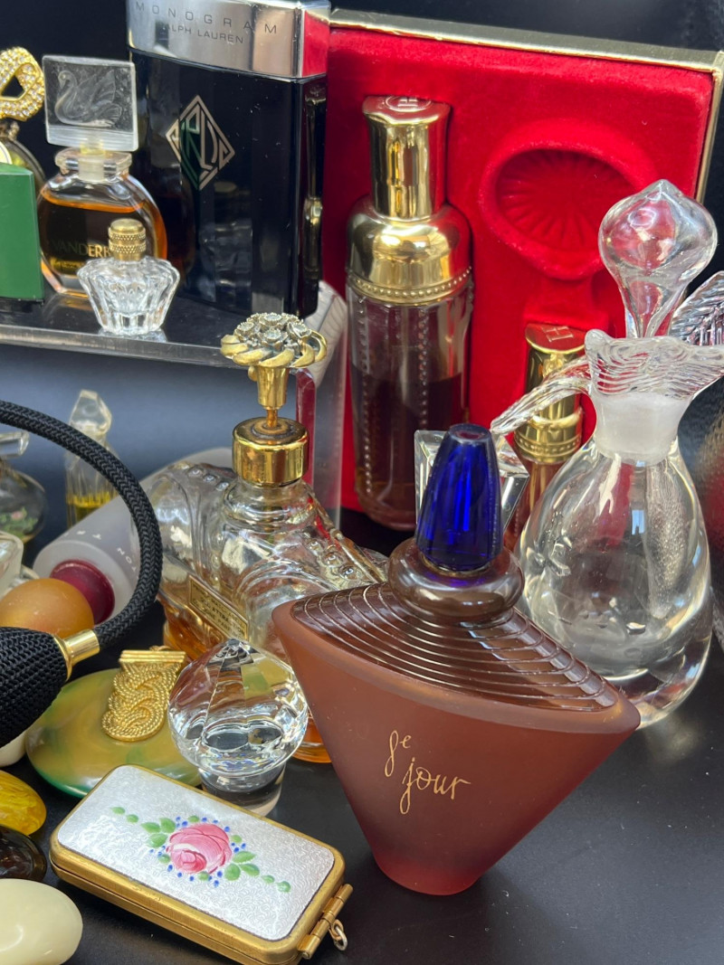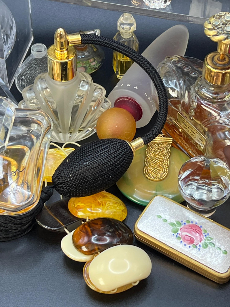 Eclectic assortment of vintage and modern perfume bottles, featuring a range of shapes, styles, and decorative designs. The collection includes cut‑glass bottles with ornate stoppers, sleek contemporary designs, atomizers, compact‑style minis, and branded pieces such as Houbigant, Ralph Lauren Monogram, White Diamonds, Prince Matchabelli and Séjour. Several bottles still contain perfume. A beautiful mixed lot ideal for collectors, display styling, or fragrance enthusiasts who appreciate unique bottle design and presentation. Also included is a bakelite bracelet (elastic is stretched).
