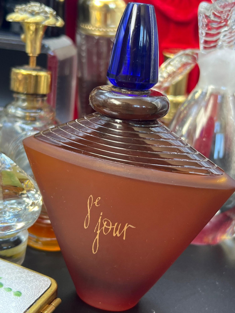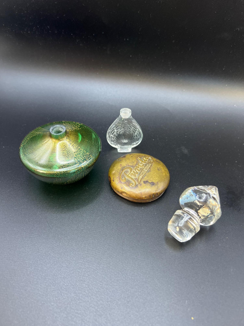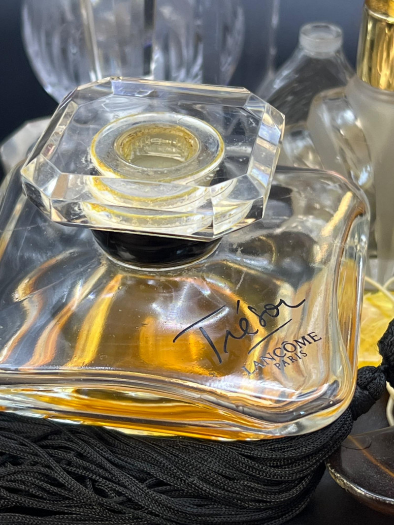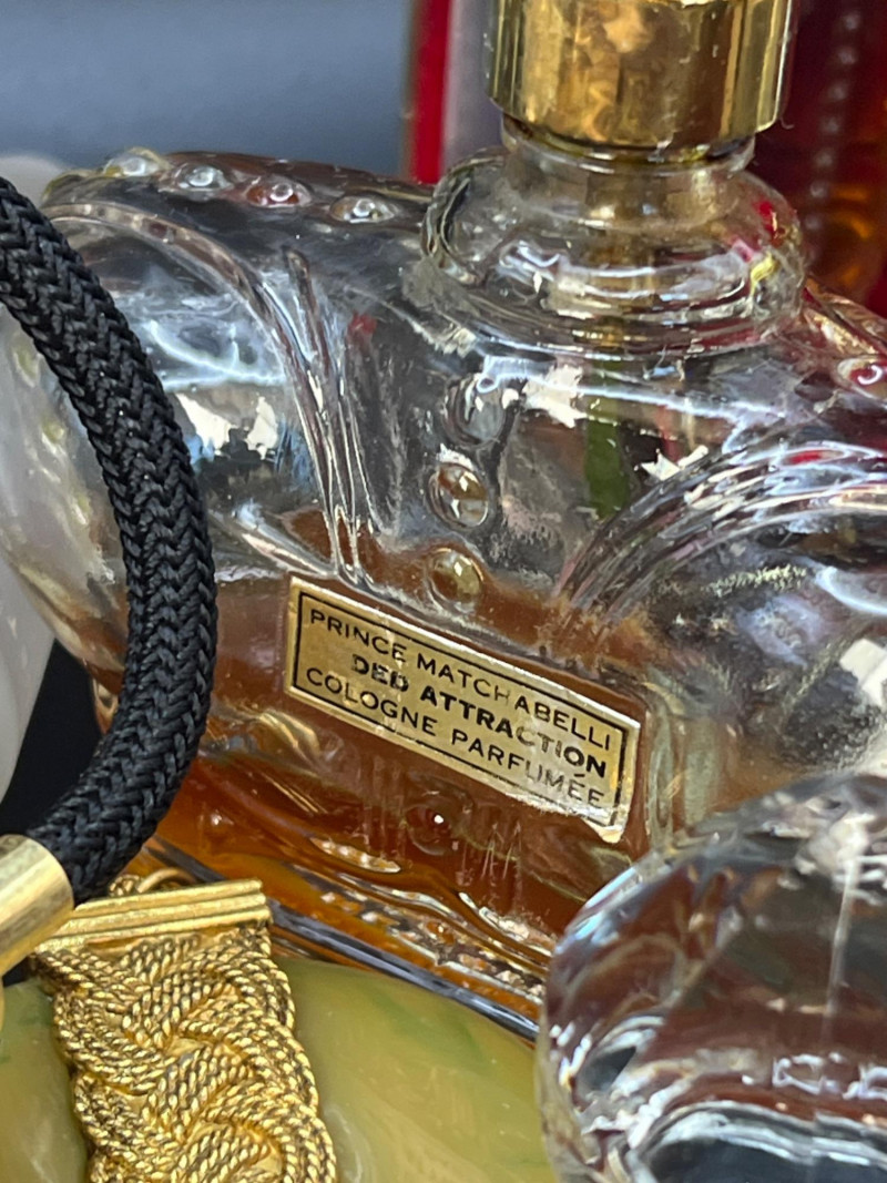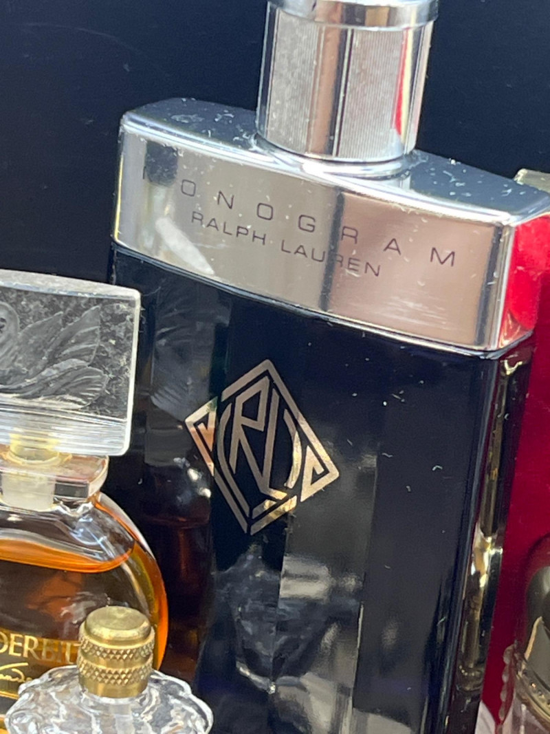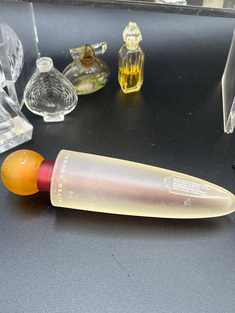 Eclectic assortment of vintage and modern perfume bottles, featuring a range of shapes, styles, and decorative designs. The collection includes cut‑glass bottles with ornate stoppers, sleek contemporary designs, atomizers, compact‑style minis, and branded pieces such as Houbigant, Ralph Lauren Monogram, White Diamonds, Prince Matchabelli and Séjour. Several bottles still contain perfume. A beautiful mixed lot ideal for collectors, display styling, or fragrance enthusiasts who appreciate unique bottle design and presentation. Also included is a bakelite bracelet (elastic is stretched).