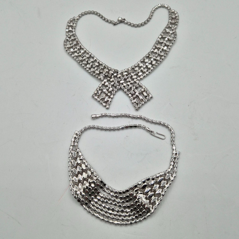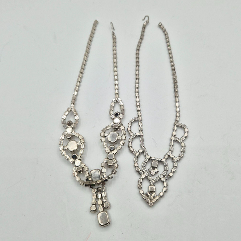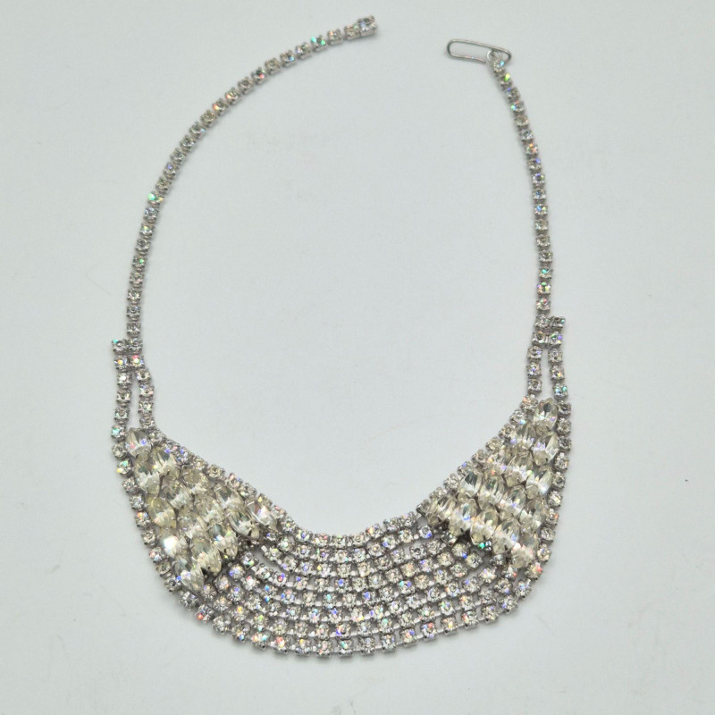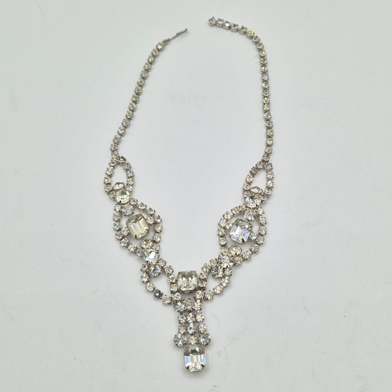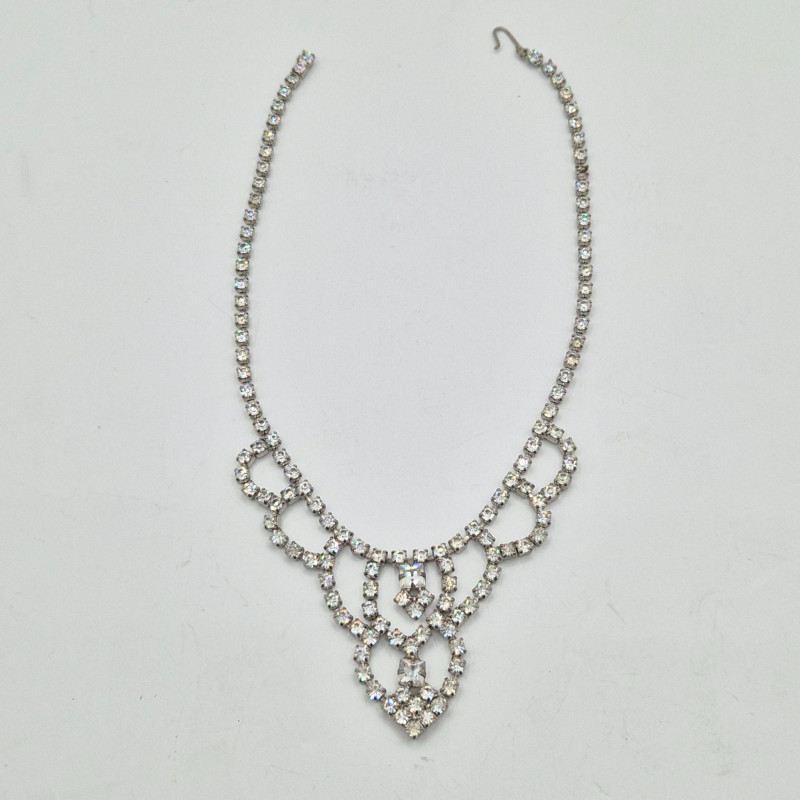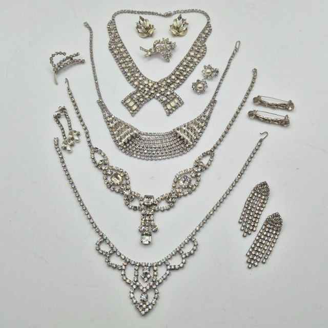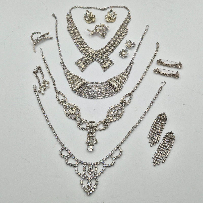 A dazzling 1950s clear rhinestone collection filled with classic mid‑century glamour. This curated assortment includes chokers, pins, earrings, and a ring—each piece showcasing the era’s love of bright, icy sparkle. The lot includes: A lovely, wearable, and collectible grouping for vintage jewelry lovers, costume jewelry collectors, or anyone who appreciates the timeless brilliance of mid‑century rhinestones.
