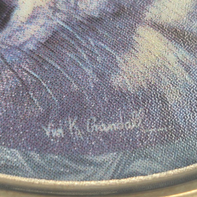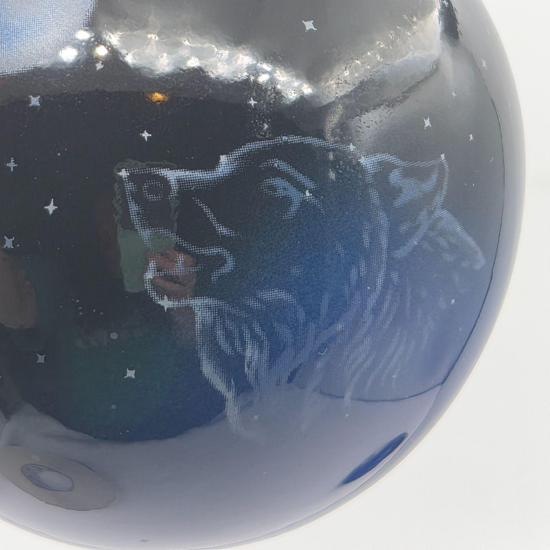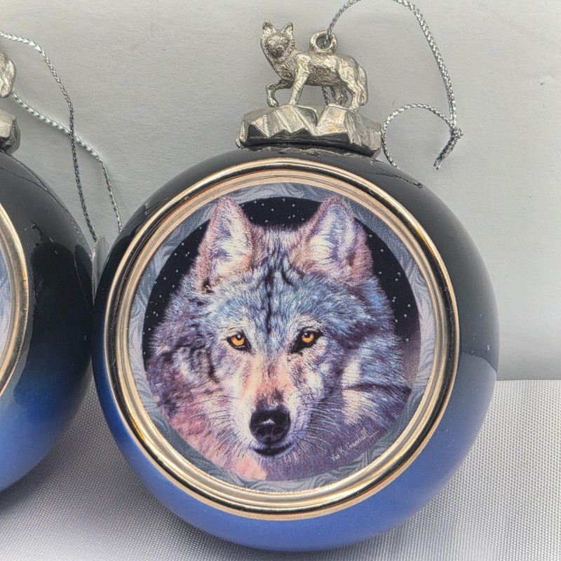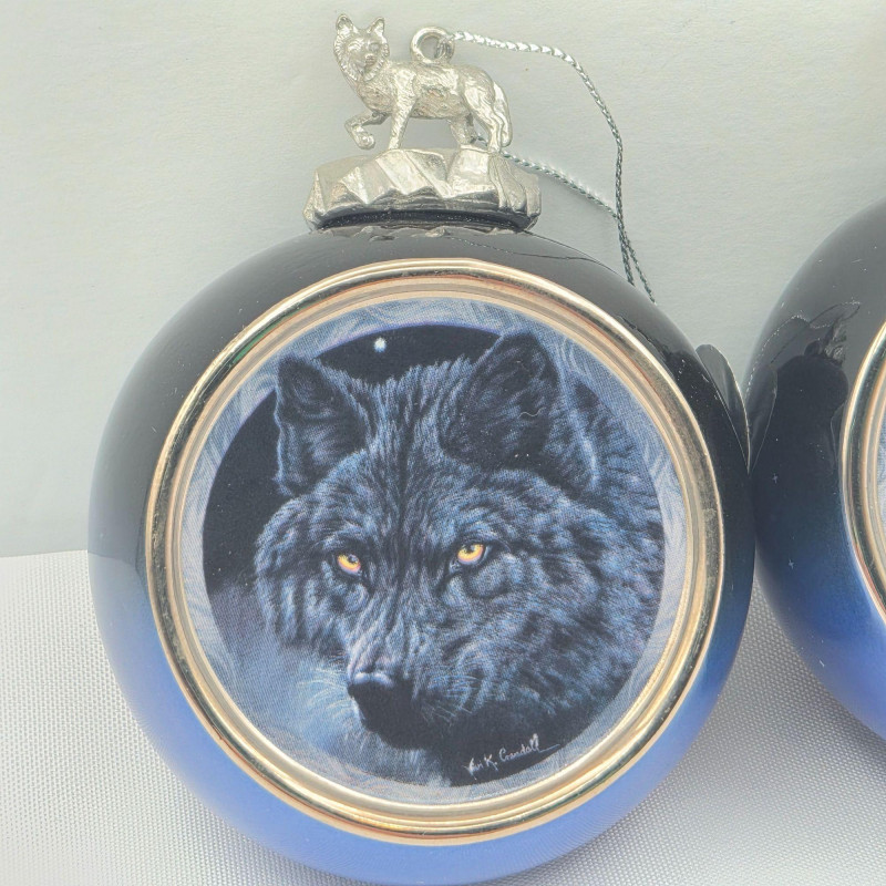 A heart‑stealing trio of porcelain collector plates from The Wild Bunch series by wildlife artist Lee Cable, issued by the Bradford Exchange. Each oval plate features sweet, expressive wolf cubs against a soft lavender background with silver painted trim, adding a gentle glow to the artwork. Included in this lot: All plates measure 8.75" x 6.5" and present beautifully for display. A wonderful set for wildlife enthusiasts, Lee Cable collectors, or anyone who loves charming animal‑themed décor. Beautiful pair of 1999 Bradfird Editions, Black Magic and Mystic Spirit Wolf glass ornaments by Vivi Crandall. Tops feature a pewter Wolf figure.