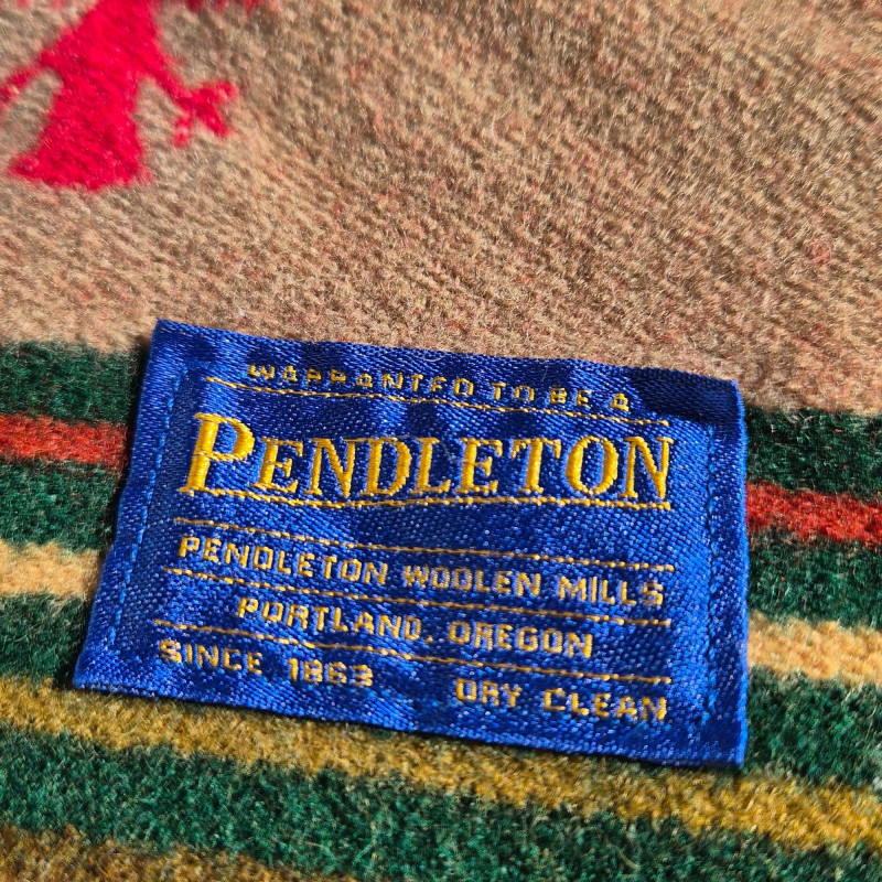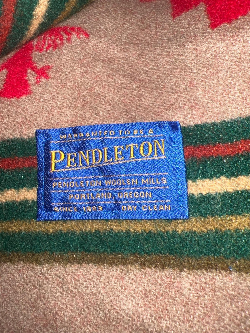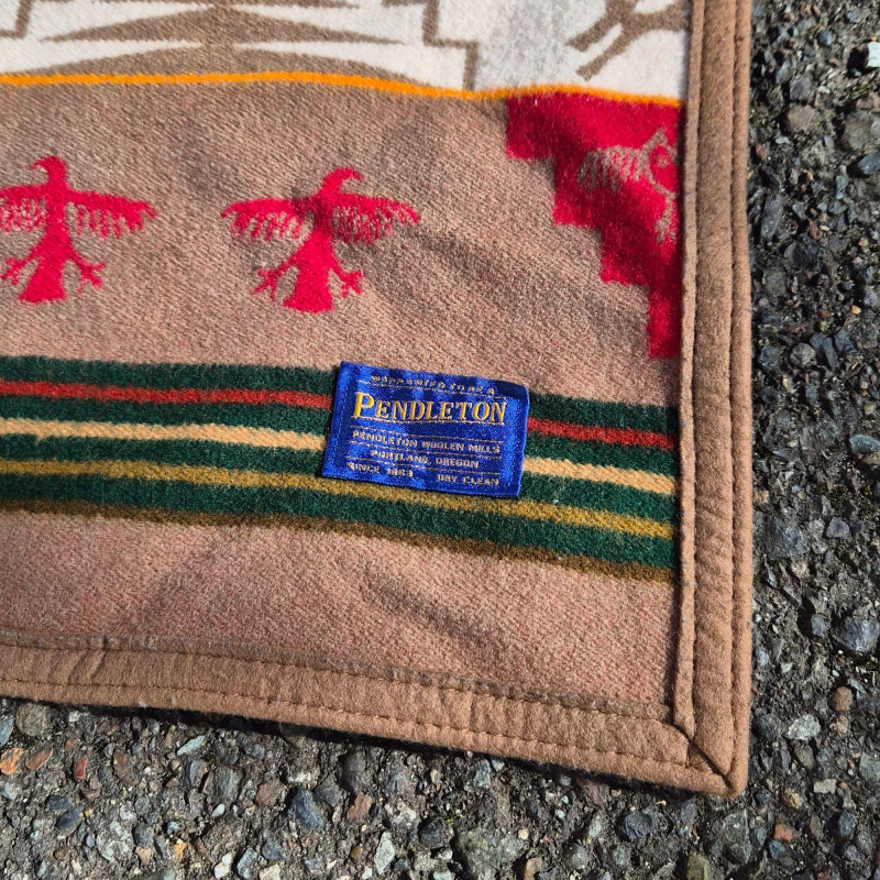 Large Pendleton cotton‑wool blanket measuring 92" x 82", featuring bold woven patterning in warm, saturated tones with stylized animal and geometric motifs. Soft, mid‑weight construction suitable for use as a bed covering or decorative textile. Estate‑found with expected wear for age; see photos for color, weave detail, and overall condition.