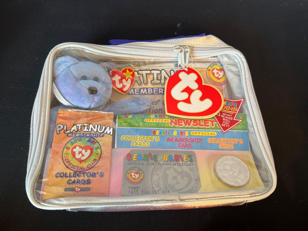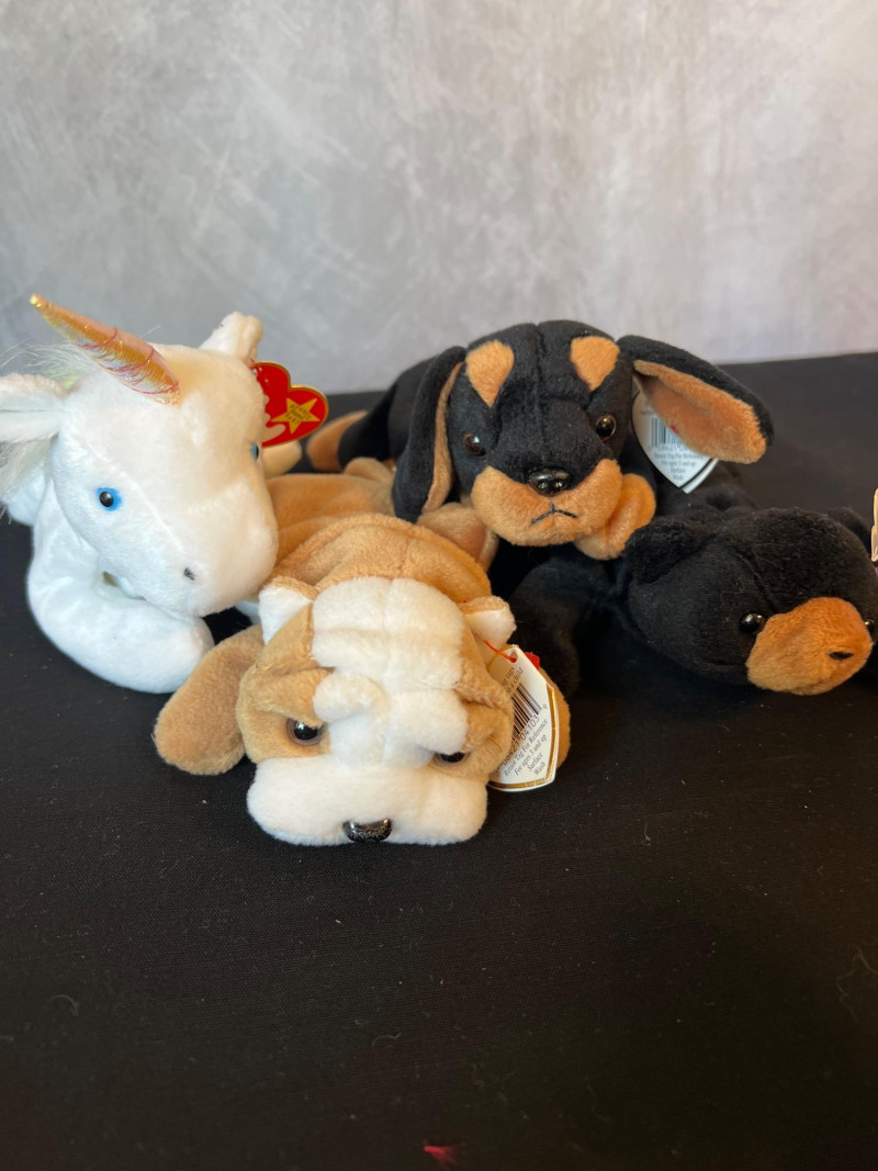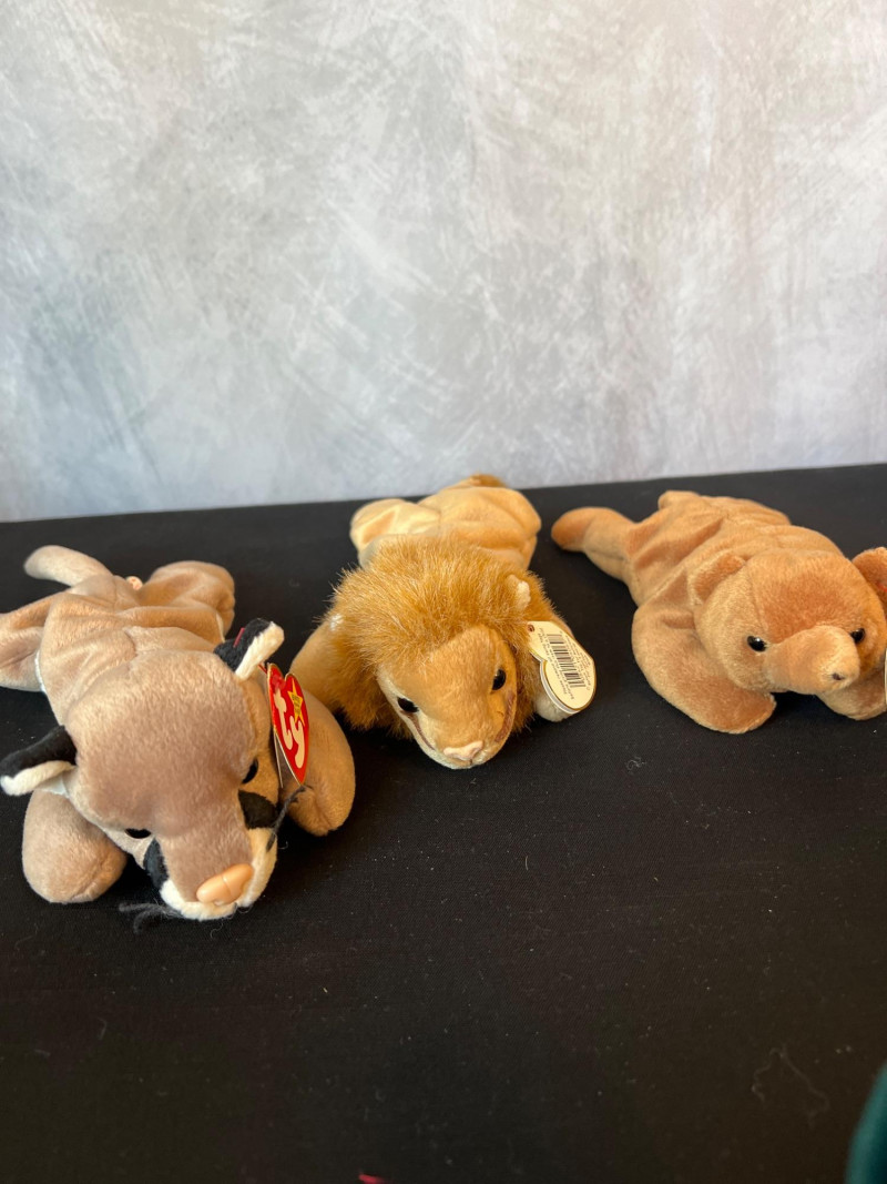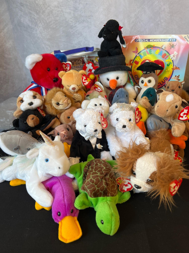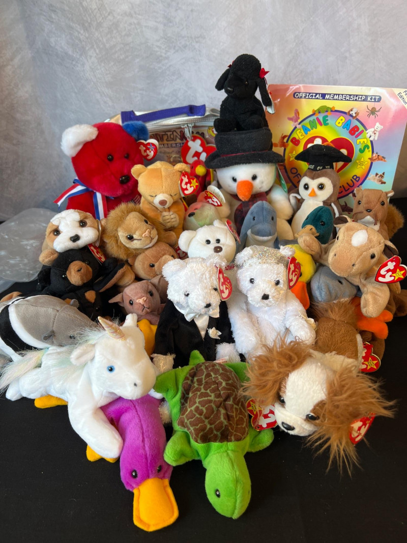 A vibrant, nostalgia‑rich assortment of retired 1990s Ty Beanie Babies and Beanie Buddies, gathered from the era when these plush characters became a cultural phenomenon. This grouping includes classic animals, bright colorways, and character favorites—each with its signature Ty heart tag. Characters such as Patti, Peace, Chocolate, Hope, Derby, Quakers, Maple, Speedy, Blackie and many more. Also included is a Build‑A‑Bear Snowman plush, adding a charming seasonal touch to the collection. You'll also find a never opened Platinum TY collector kit and a collector folder with stickers, along with a bag of plastic heart-shaped tag protectors. A wonderful bundle for collectors, resellers, or anyone who loves the iconic softness and personality of vintage plush. Many pieces in this era are no longer produced, making this a fun and display‑ready mix of retired favorites.