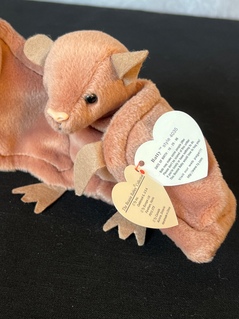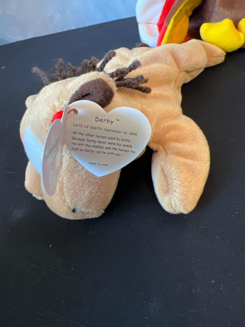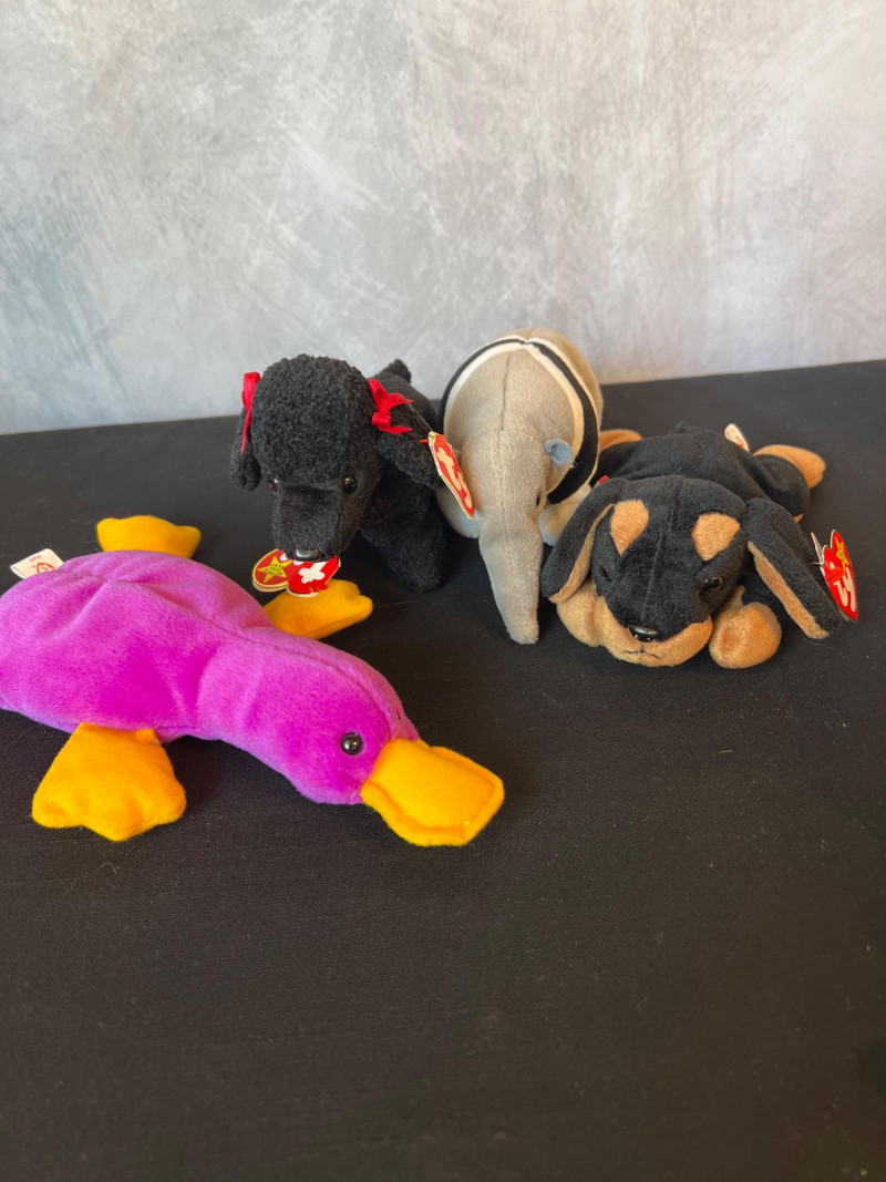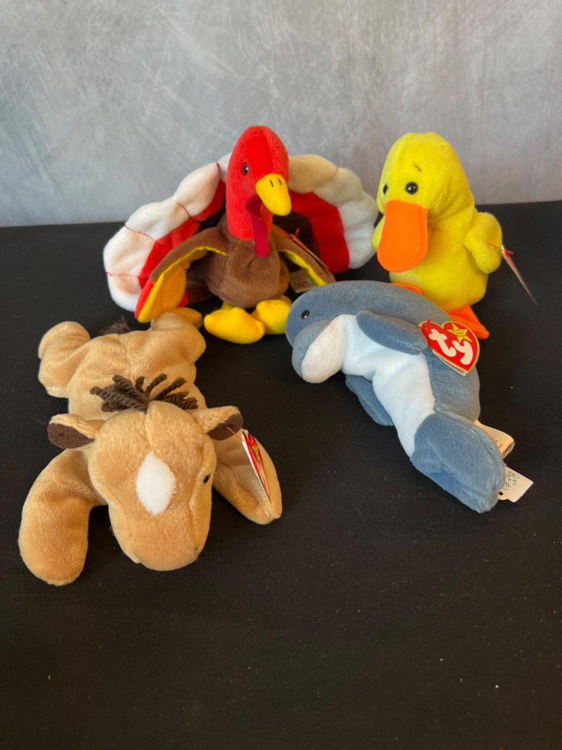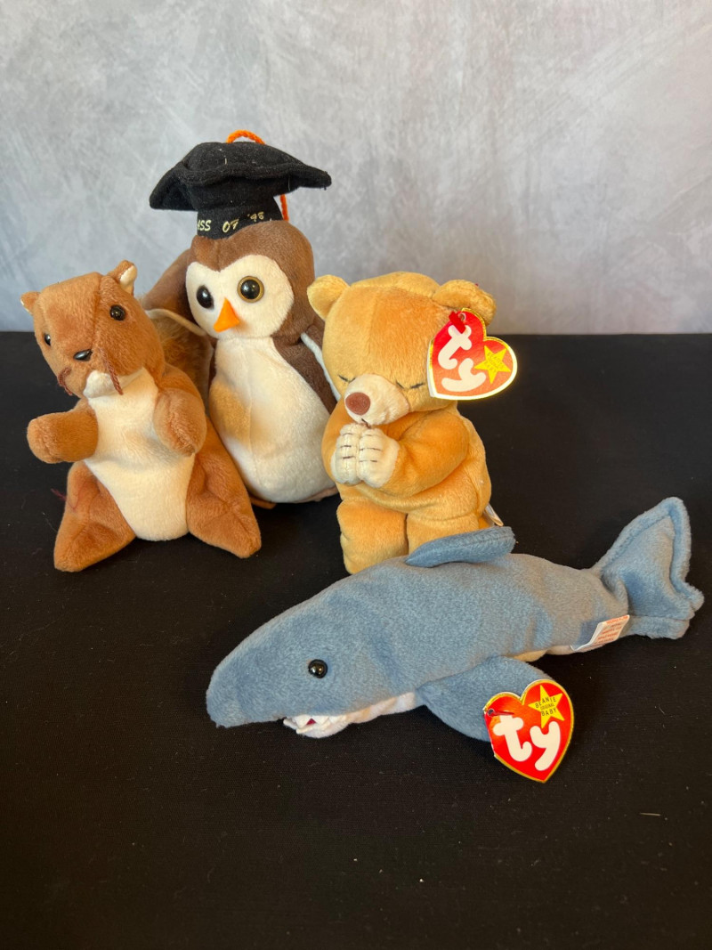 A vibrant, nostalgia‑rich assortment of retired 1990s Ty Beanie Babies and Beanie Buddies, gathered from the era when these plush characters became a cultural phenomenon. This grouping includes classic animals, bright colorways, and character favorites—each with its signature Ty heart tag. Characters such as Patti, Peace, Chocolate, Hope, Derby, Quakers, Maple, Speedy, Blackie and many more. Also included is a Build‑A‑Bear Snowman plush, adding a charming seasonal touch to the collection. You'll also find a never opened Platinum TY collector kit and a collector folder with stickers, along with a bag of plastic heart-shaped tag protectors. A wonderful bundle for collectors, resellers, or anyone who loves the iconic softness and personality of vintage plush. Many pieces in this era are no longer produced, making this a fun and display‑ready mix of retired favorites.