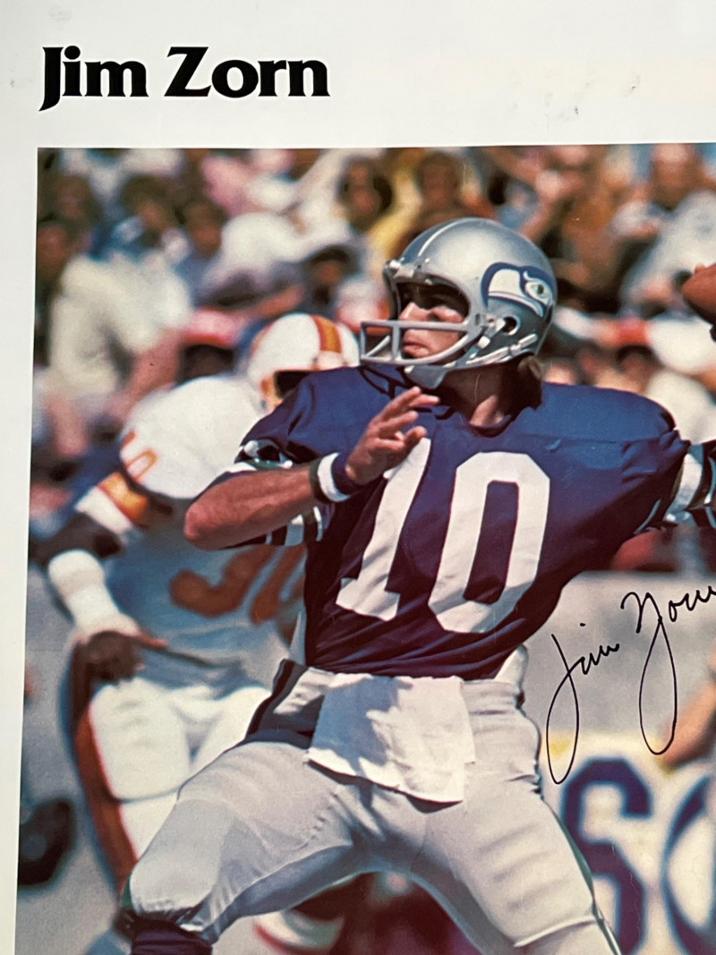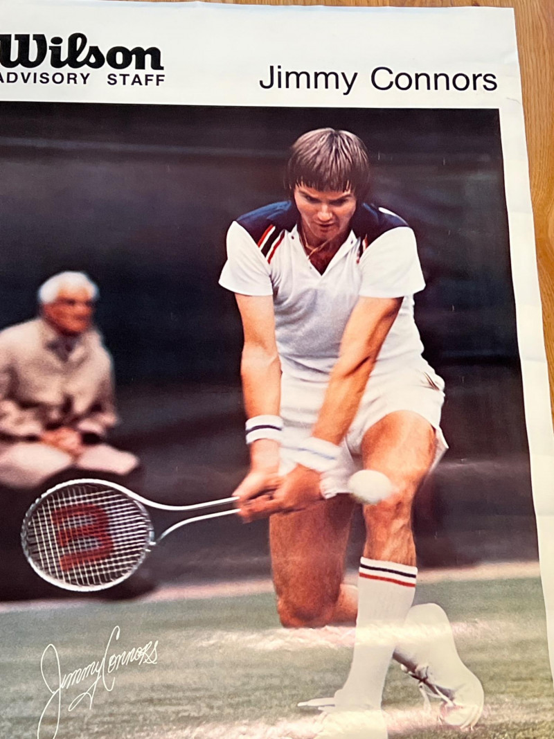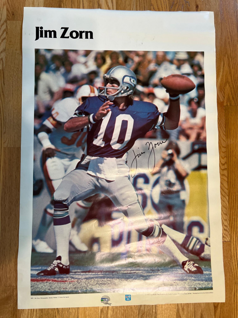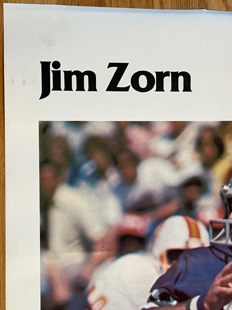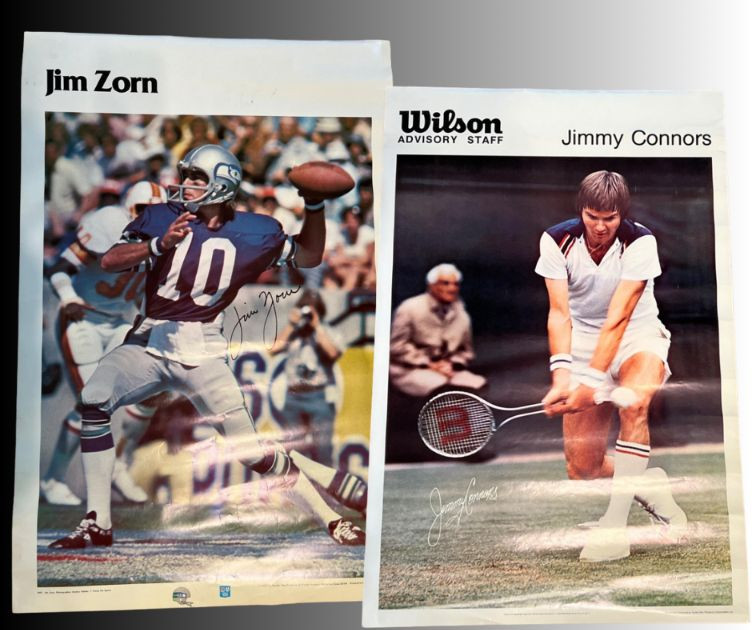 A pair of vintage sports posters featuring two iconic athletes from different arenas: Legacy Seahawk, NFL quarterback, Jim Zorn and tennis champion Jimmy Connors. Each poster showcases dynamic action photography from their competitive prime and includes the athlete’s printed facsimile signature. Zorn poster (36"h x 24"w) captures a classic passing stance in full uniform. Connors poster (34"h x 23"w) highlights his powerful court presence in a Wilson‑branded design. Ideal for sports collectors, fan cave décor, or anyone building a multi‑sport display. Condition consistent with age and prior handling. See pictures.