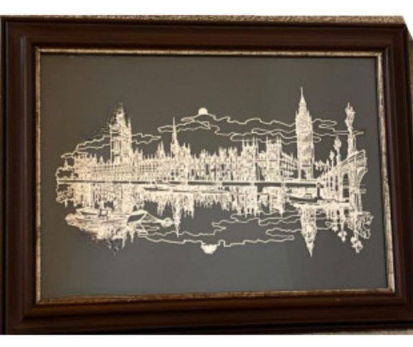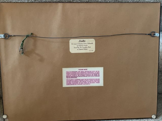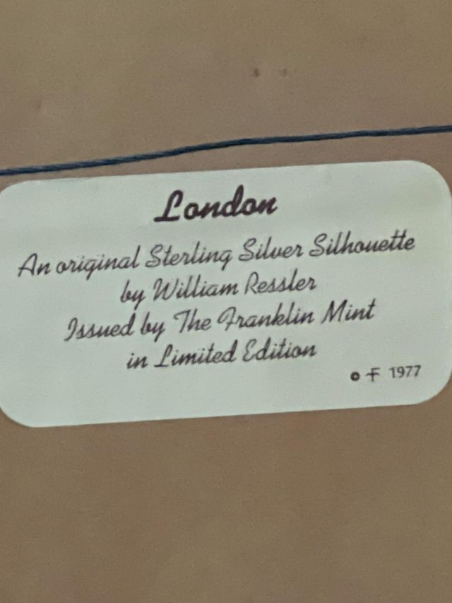 Limited‑edition Sterling Silver Silhouette of London, designed by artist William Ressler and issued by the Franklin Mint in 1977. The artwork features an intricately rendered skyline of London (including the Palace of Westminster and Big Ben) etched in sterling silver and in its original frame. A striking collectible combining fine metalwork with architectural artistry.