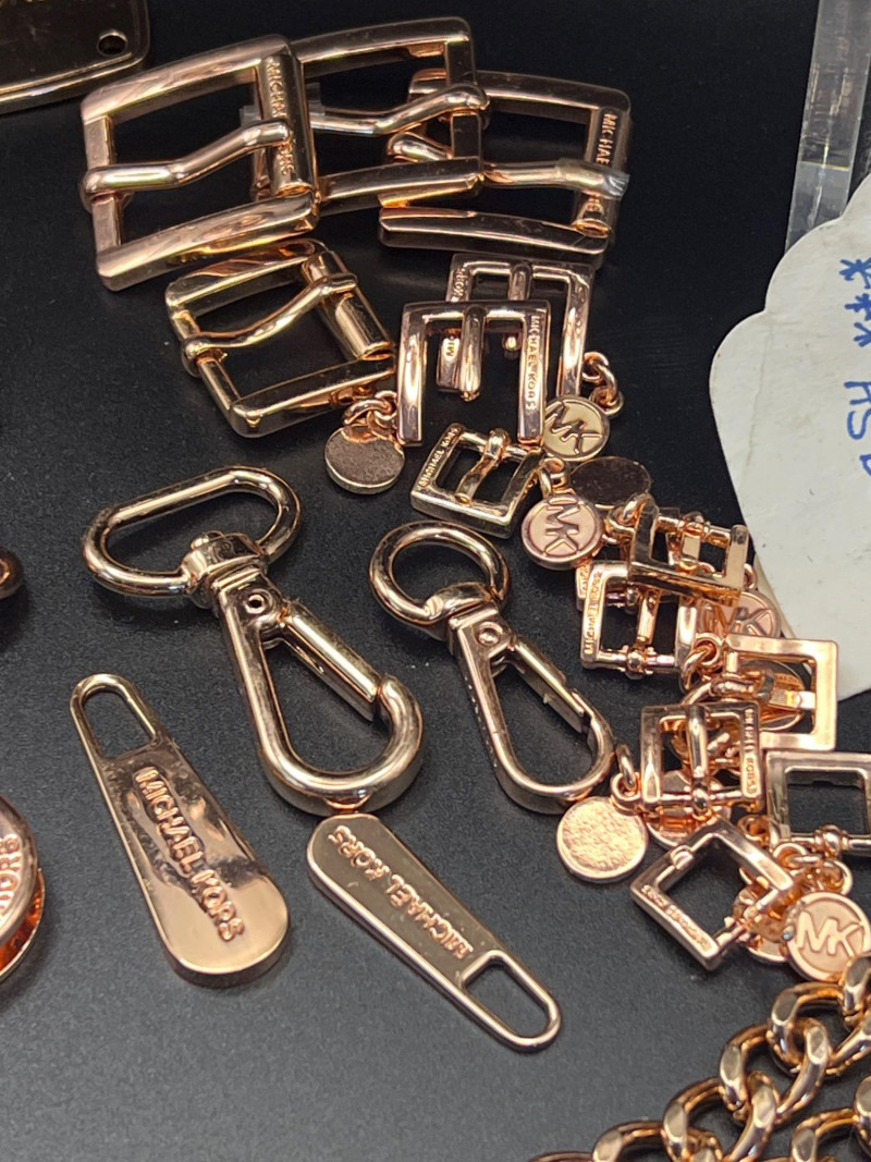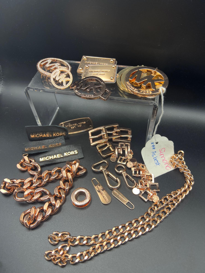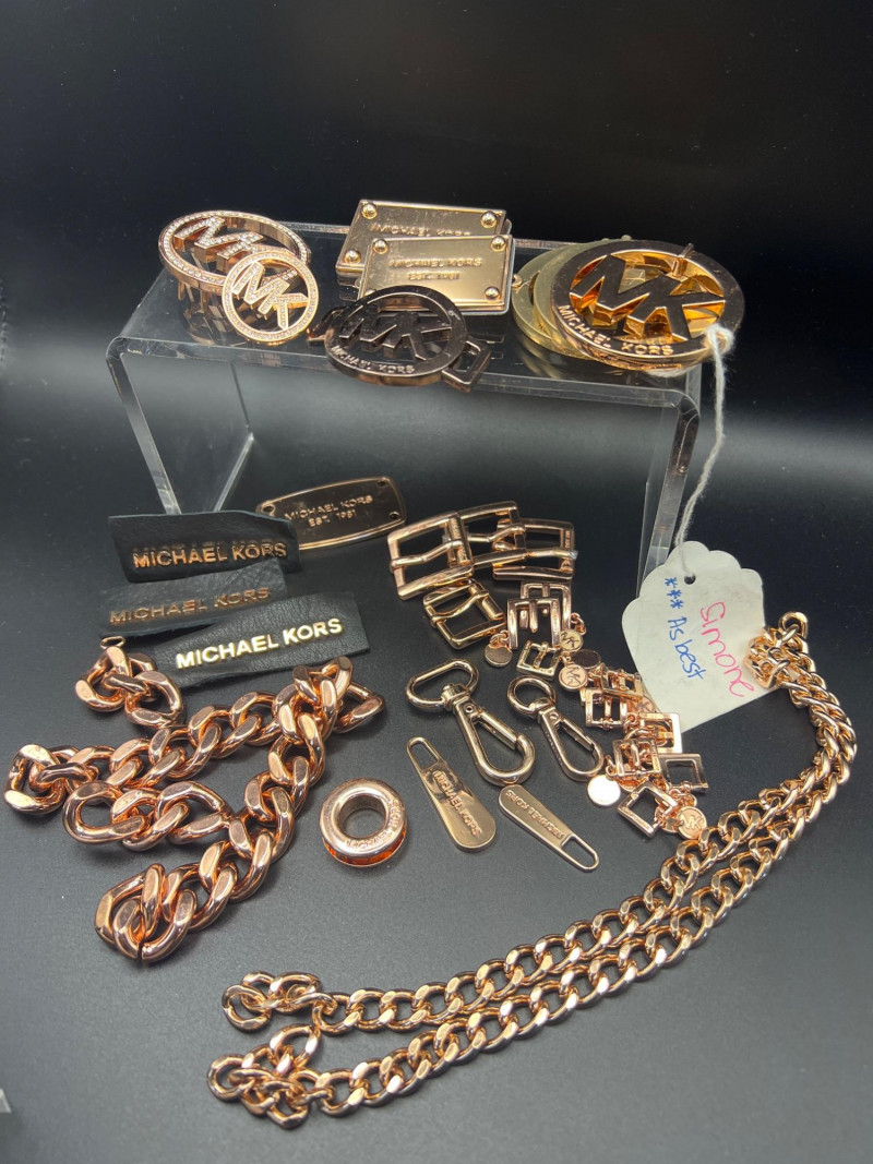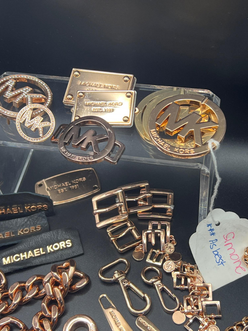 Collection of authentic Michael Kors rose‑gold–tone hardware components, ideal for handbag repair, restoration, upcycling, or designer crafting projects. Includes: MK Logo Medallions Rectangular Nameplates engraved MICHAEL KORS EST. 1981 Zipper Pulls & Tabs Buckles, Clasps & Strap Hardware Chain Links & Connectors Fabric MK Tags in black with gold lettering A versatile assortment of branded components in a polished rose‑gold finish — perfect for replacing missing parts, customizing bags, or adding designer detail to creative projects.