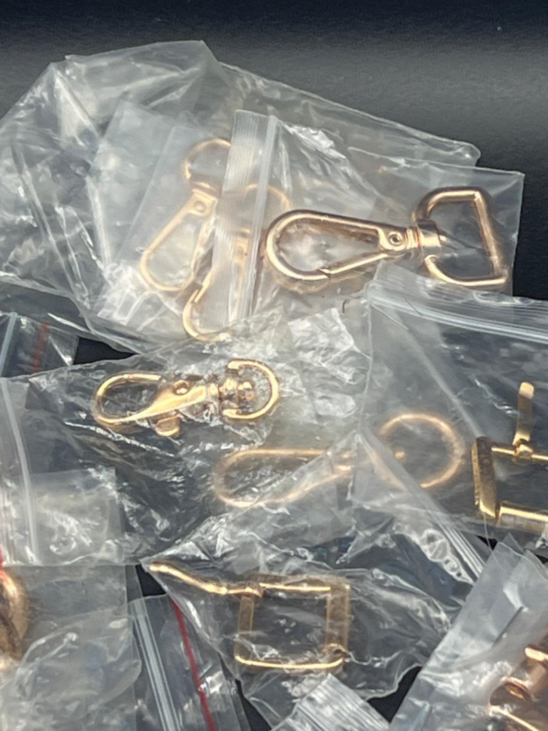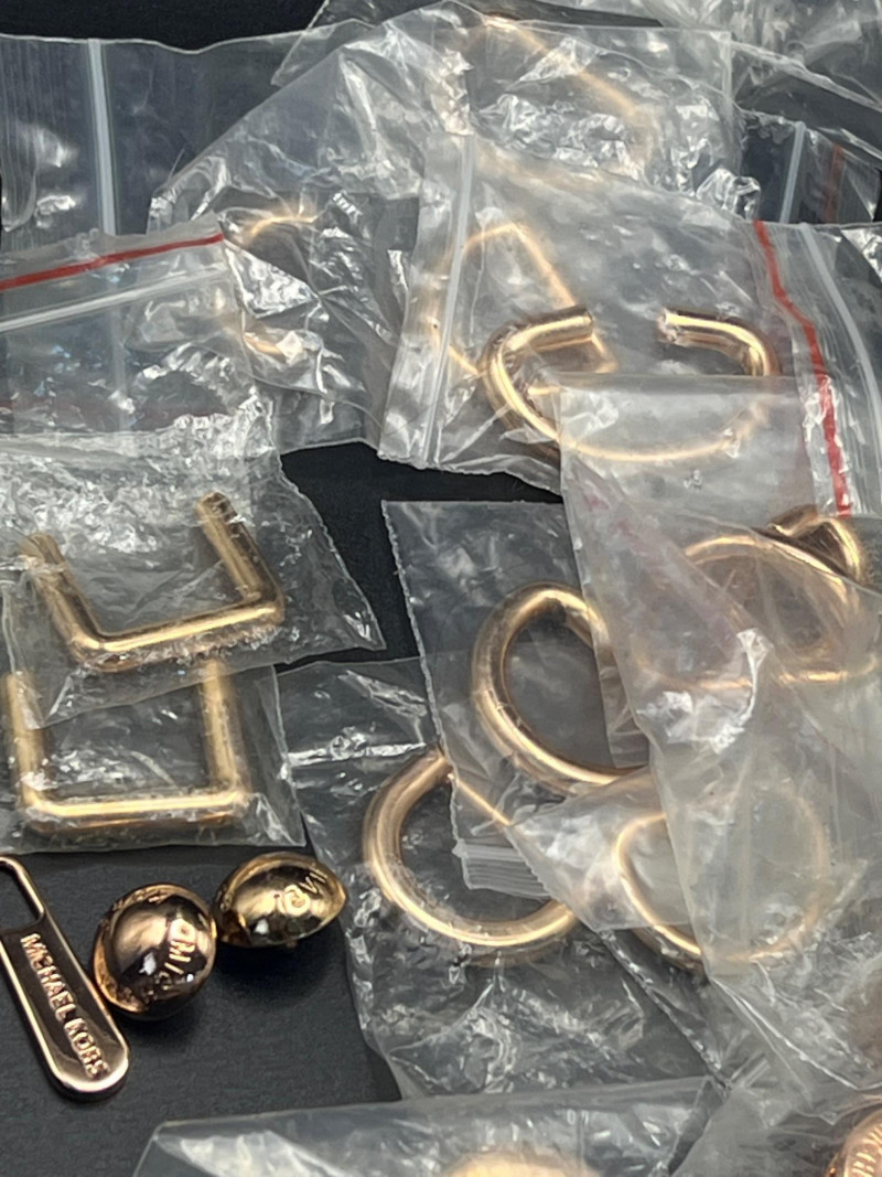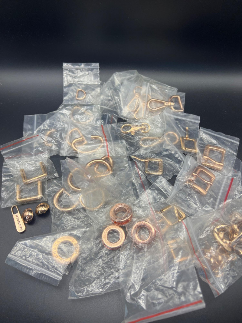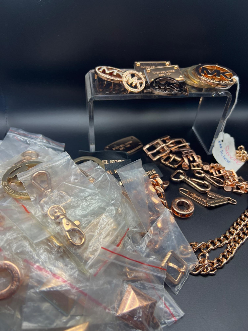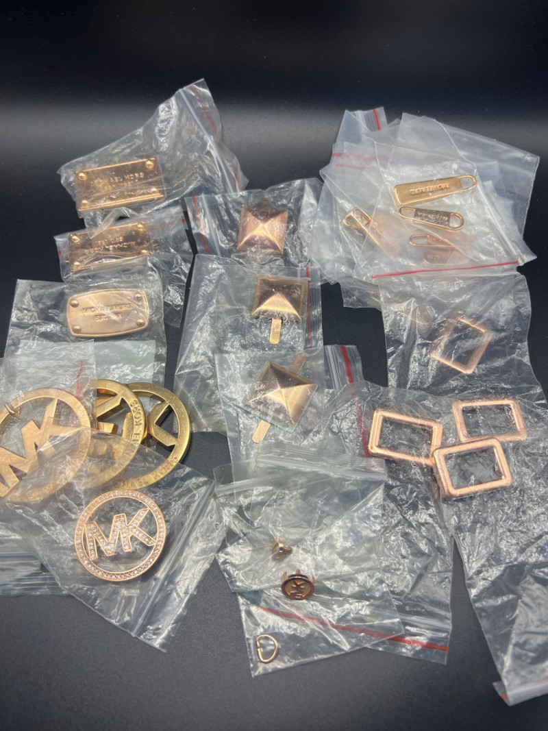 Collection of authentic Michael Kors rose‑gold–tone hardware components, ideal for handbag repair, restoration, upcycling, or designer crafting projects. Includes: MK Logo Medallions Rectangular Nameplates engraved MICHAEL KORS EST. 1981 Zipper Pulls & Tabs Buckles, Clasps & Strap Hardware Chain Links & Connectors Fabric MK Tags in black with gold lettering A versatile assortment of branded components in a polished rose‑gold finish — perfect for replacing missing parts, customizing bags, or adding designer detail to creative projects.