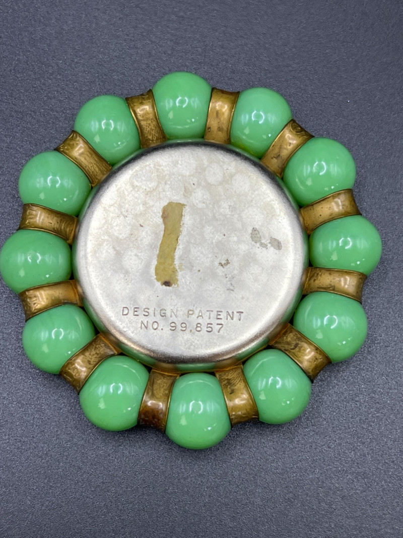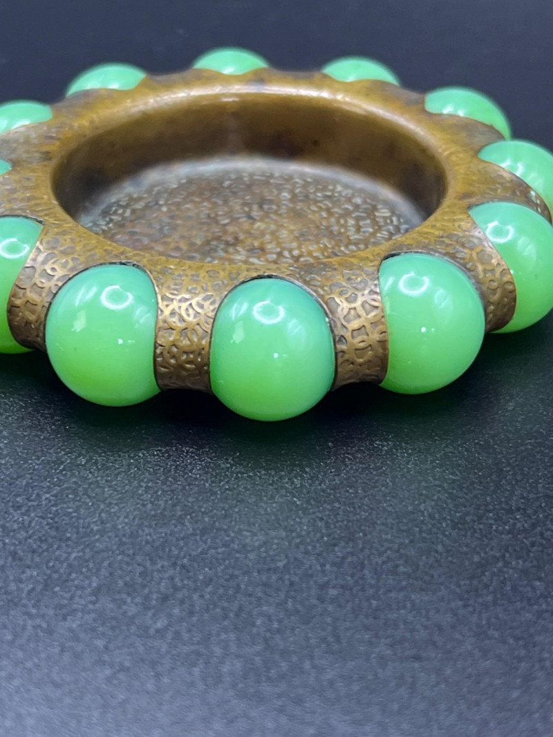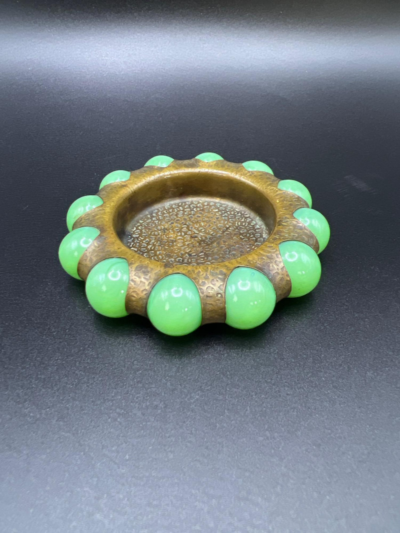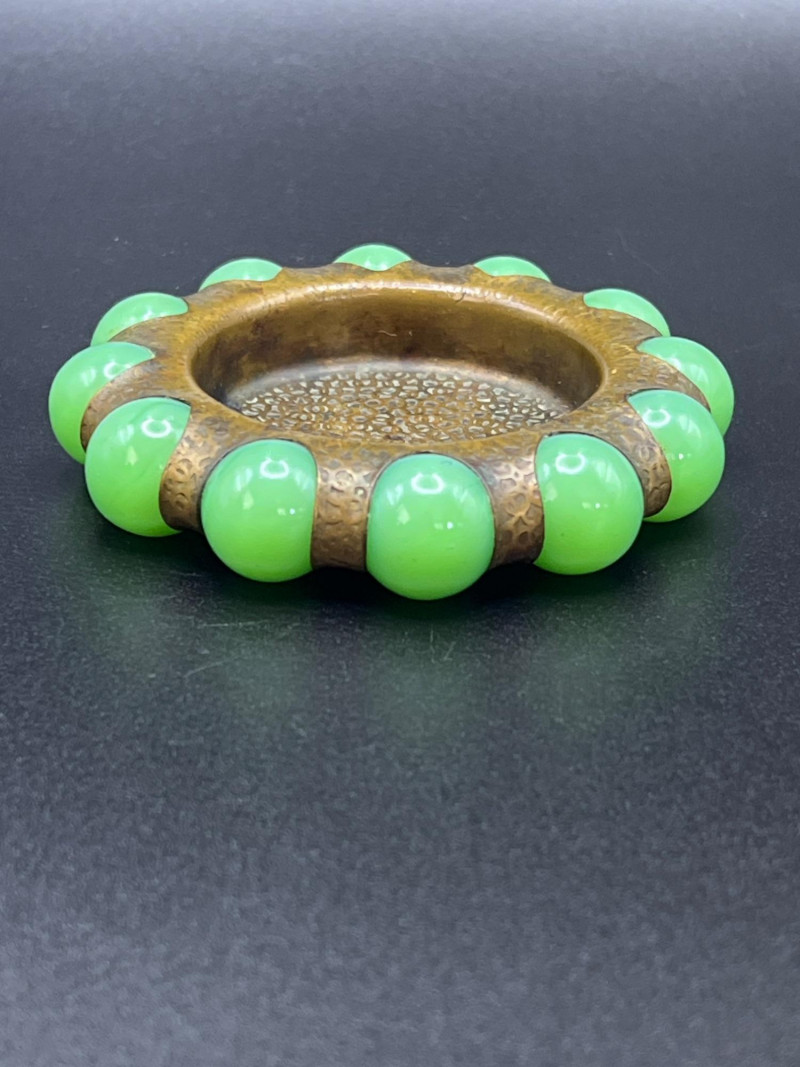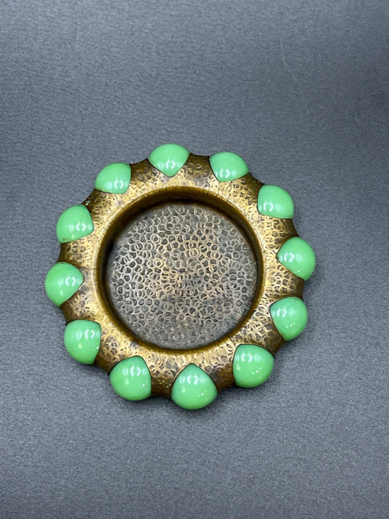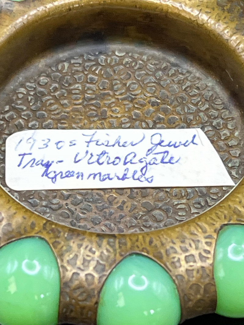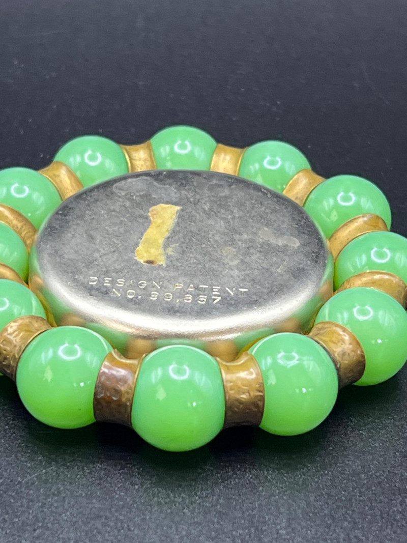 A circular, Art Deco style brass vanity tray featuring a hammered finish and a decorative border of jadeite-colored glass marbles. These iconic trays were created under a design patent granted in 1936 to A.R. Fisher. They were frequently manufactured in collaboration with glass cmopanies like the Vitro Agate Company, which provided the colorful glass marbles (jadeite toned). These trays became highly popular during the late 1930's and were often sold as fashionable vanity or desk accessories during the Art Deco era.