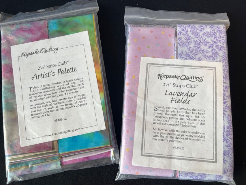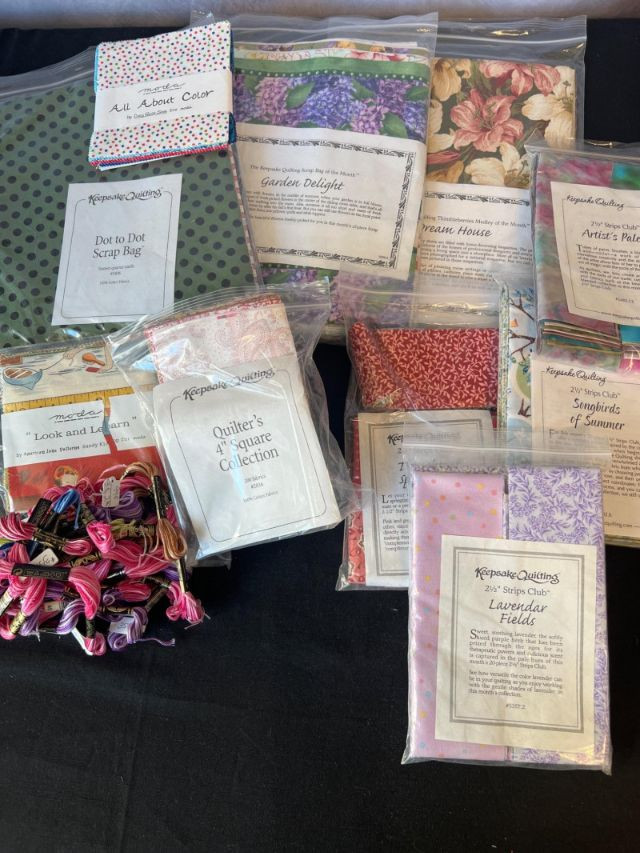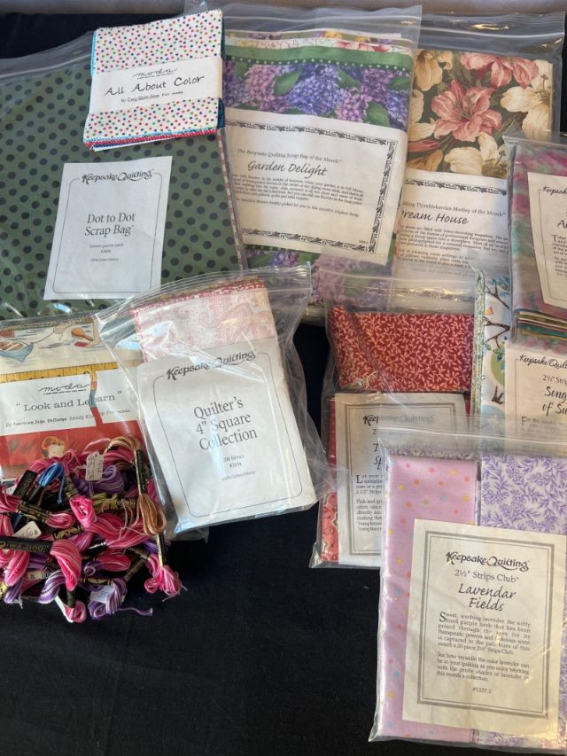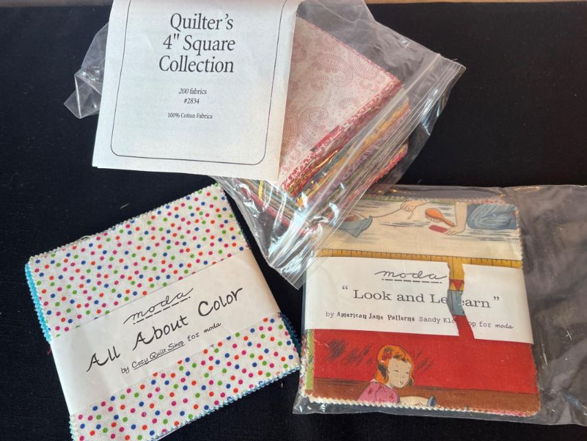 Large mixed lot of Keepsake Quilting and Moda precut fabrics, ideal for quilting, crafting, and small‑batch textile projects.